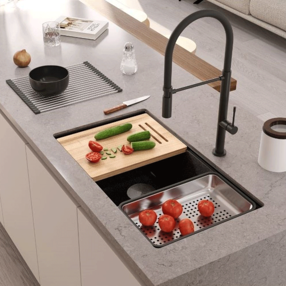 Logan 120 GraniteQ dwukomorowy zlewozmywak to połączenie nowoczesnej elegancji i wyjątkowej funkcjonalności, które doskonale sprawdzi się w każdej kuchni. Dzięki możliwości montażu wpuszczanego lub podwieszanego, model ten bez trudu dopasuje się do różnych stylów i rodzajów blatów, oferując jednocześnie wygodę i trwałość. Dwie przestronne komory umożliwiają jednoczesne wykonywanie różnych czynności, takich jak mycie, płukanie czy namaczanie, co pozwala zaoszczędzić czas i wodę, a także zapewnia pełną elastyczność podczas codziennych obowiązków. Zintegrowany rant pozwala na zastosowanie funkcjonalnych akcesoriów, takich jak deska do krojenia z jesionu, zwijana mata czy ociekacz, które znacznie powiększają strefę roboczą i podnoszą komfort pracy w kuchni. Model LOGAN 120 to idealne rozwiązanie dla wymagających użytkowników, które nie tylko ułatwia codzienne zadania, ale także wprowadza do kuchni wyjątkowy styl i nowoczesne rozwiązania, maksymalizując wygodę i efektywność.