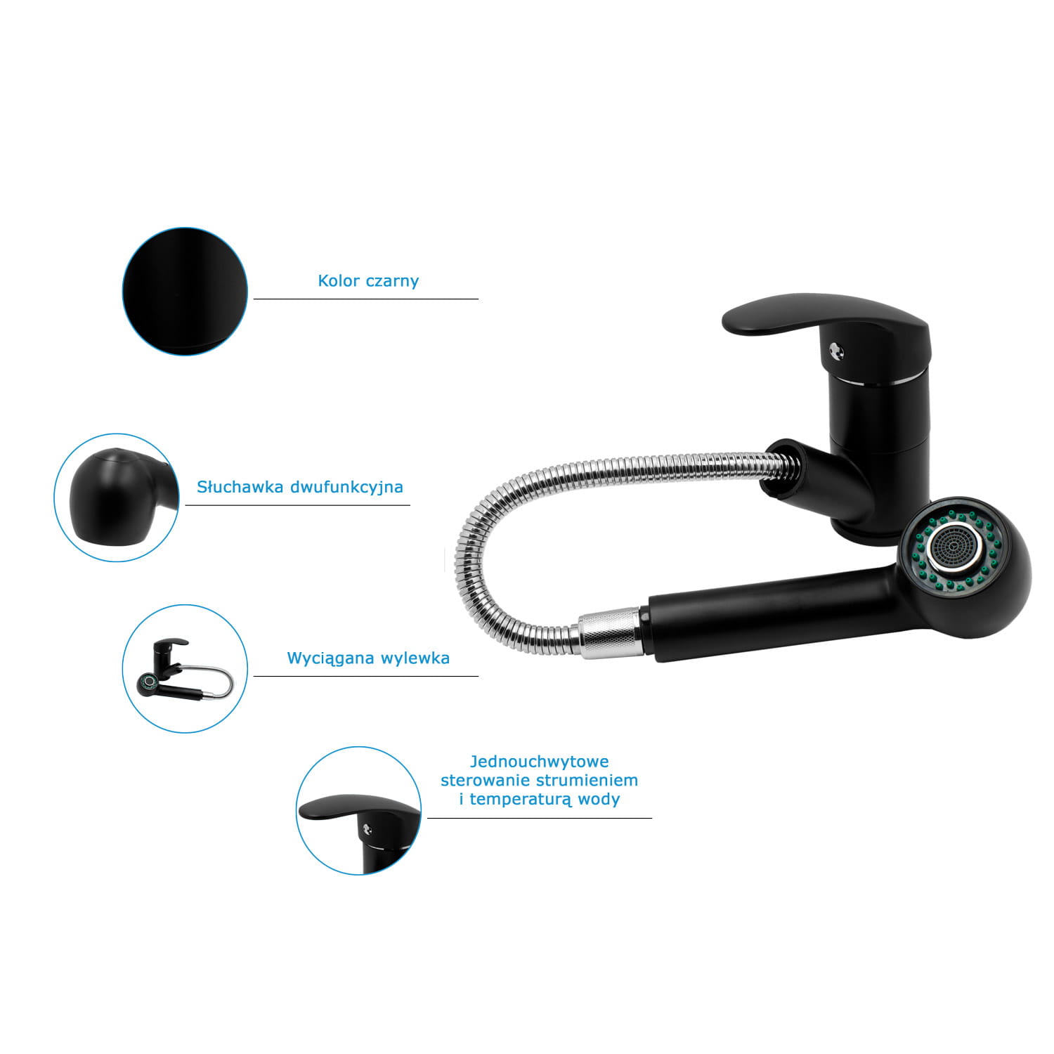 Aset czarna bateria kuchenna z wyciąganą wylewką