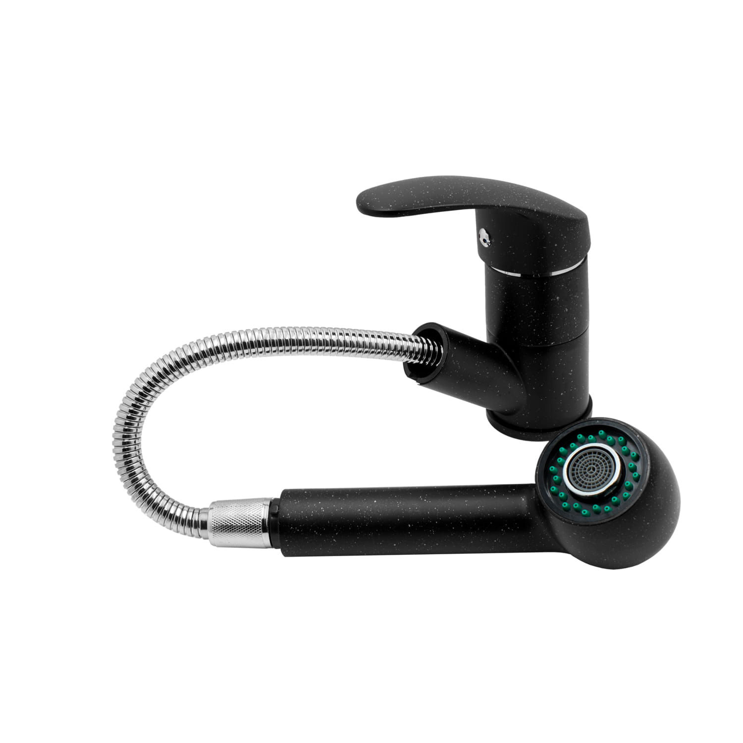 ASET bateria kuchenna z wyciąganą wylewką o wysokiej jakości, wykonana z mosiądzu, w kolorze czarnym/nakrapiany. Słuchawka wykonana z tworzywa PCV. Powłoka baterii odporna na przebarwienia i wysoką temperaturę. Ceramiczna głowica 40 mm. Obrotowa, wyciągana wylewka. Dwa rodzaje strumienia wody. System anty - kamień, zapobiegający odkładaniu się kamienia na słuchawce. Perlator napowietrzający m24. Standardowy otwór montażowy 35 mm.