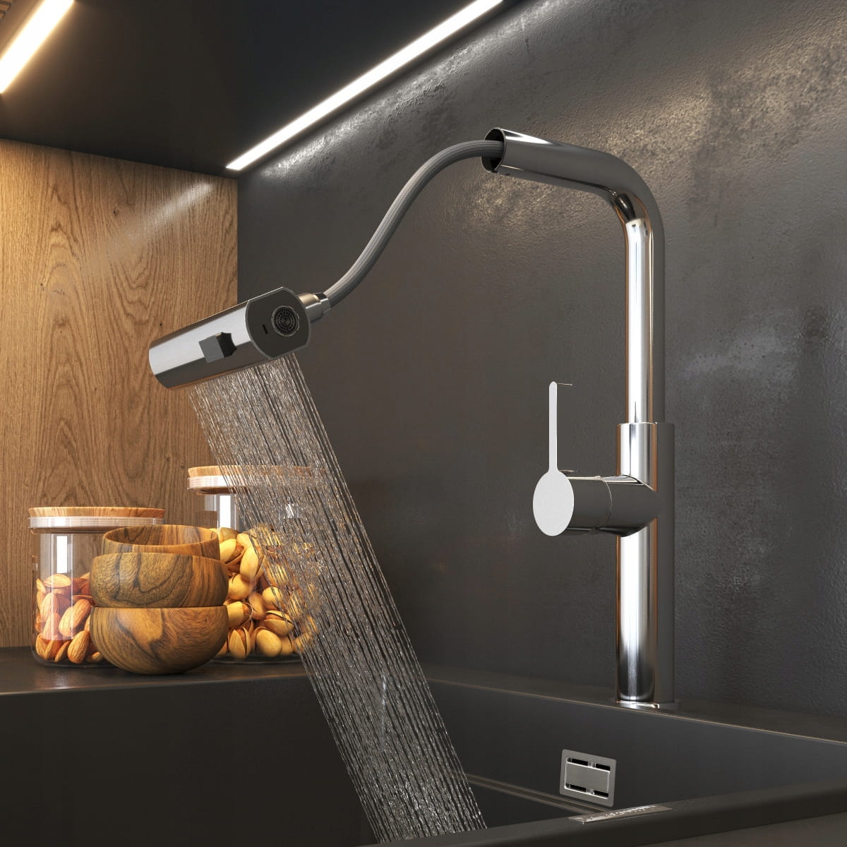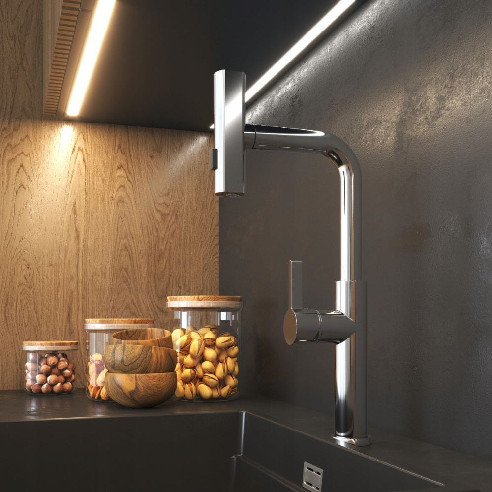 Giro to ultranowoczesny kran kuchenny, który wyróżnia się ciekawym designem i ponadprzeciętną funkcjonalnością. Bateria wyposażona jest wyciąganą, obrotową wylewkę, której ułożenie zależy od wybranego strumienia wody. Model posiada 3-funkcyjną słuchawkę, która w zależności od potrzeb może emitować standardowy strumień, szeroki strumień deszczownicy, a także lżejszą mgiełkę. Nietuzinkowy wygląd kranu sprawia, że pasuje on do stylowych przestrzeni kuchennych, w którym będzie modnym i pożytecznym dodatkiem. Głowica ceramiczna. Powłoka odporna na wysoką temperaturę i przebarwienia.