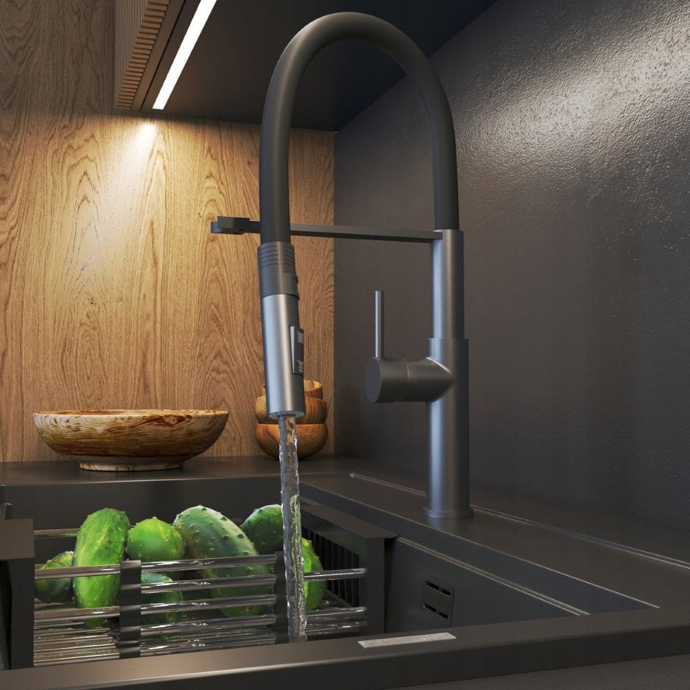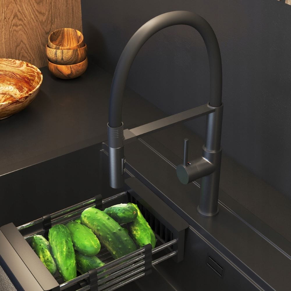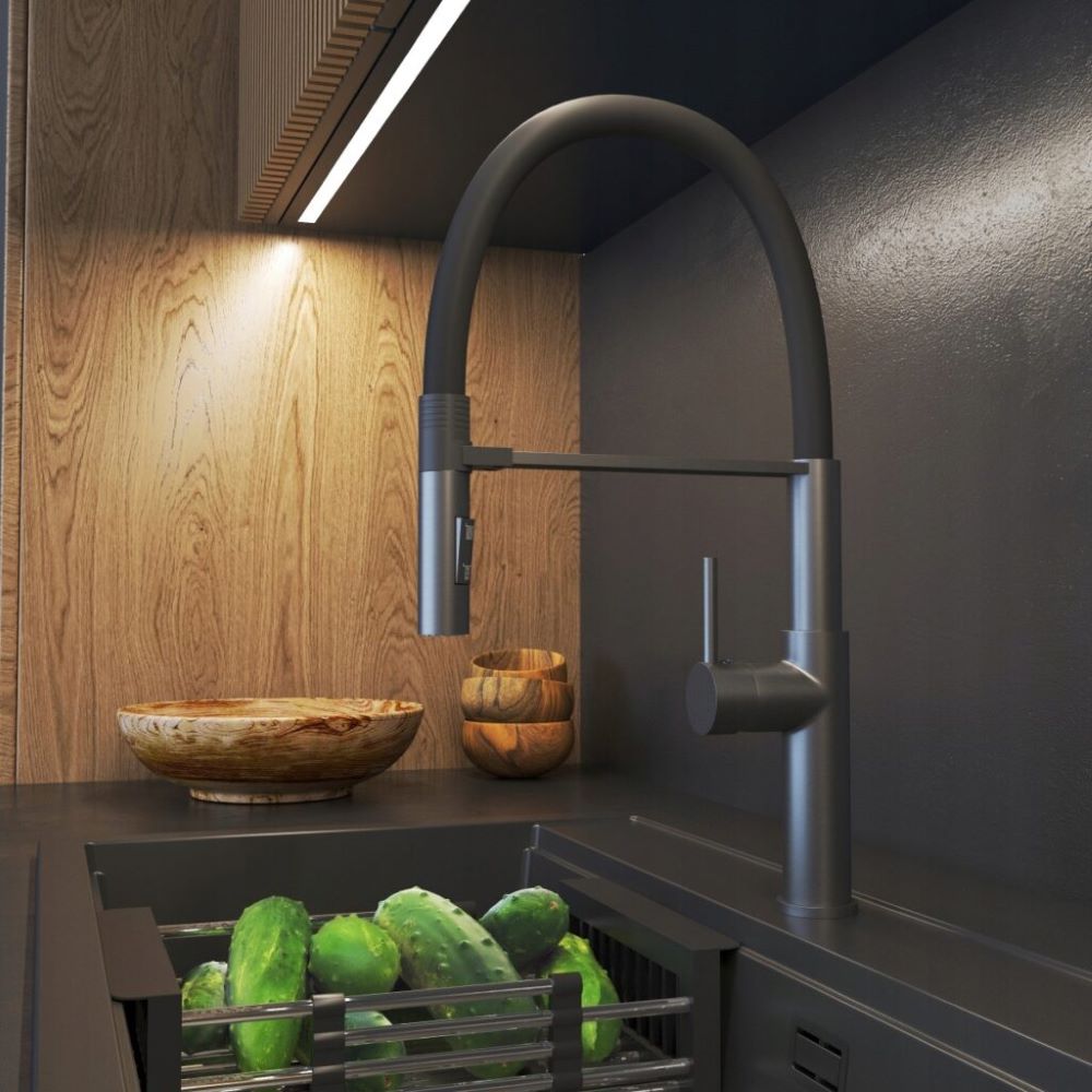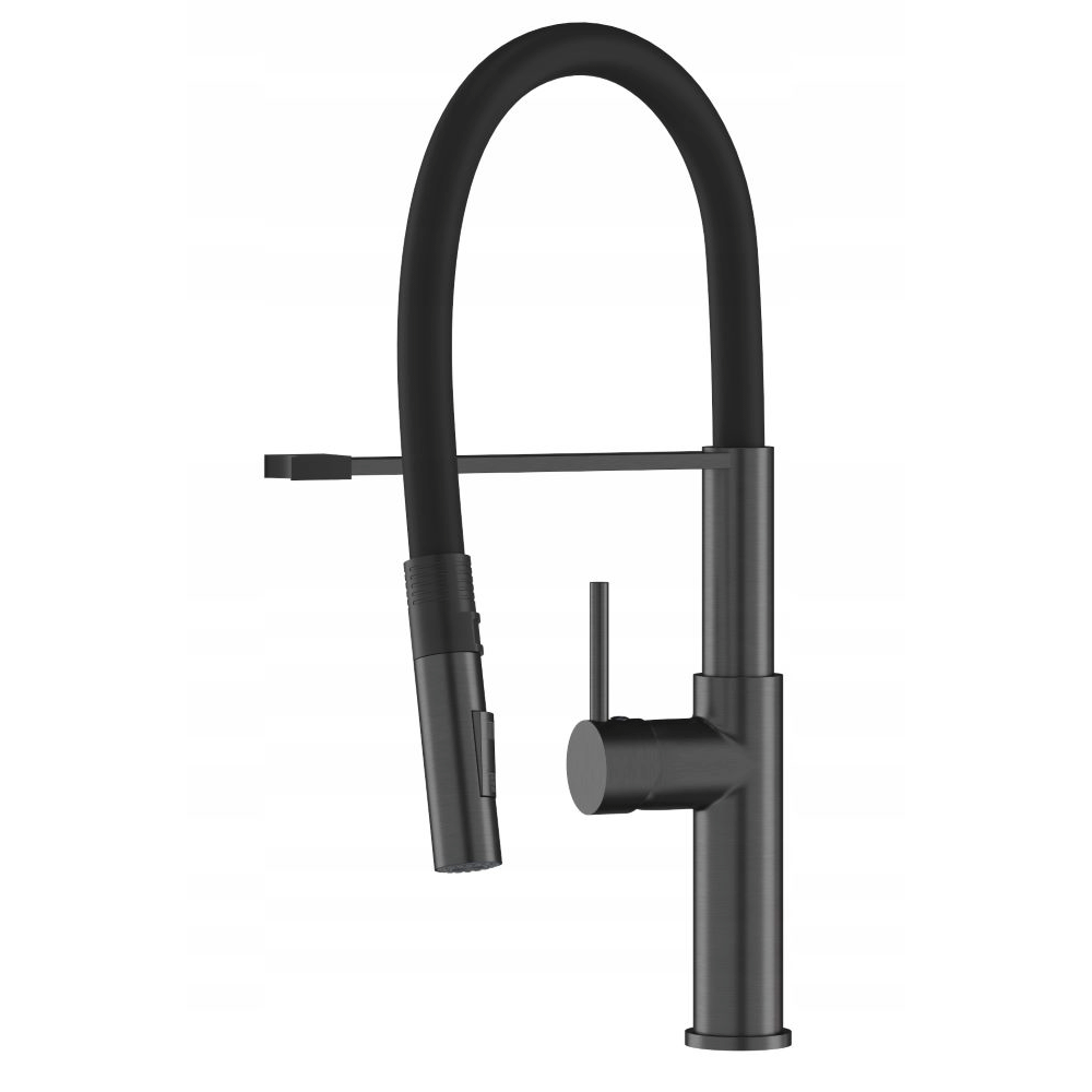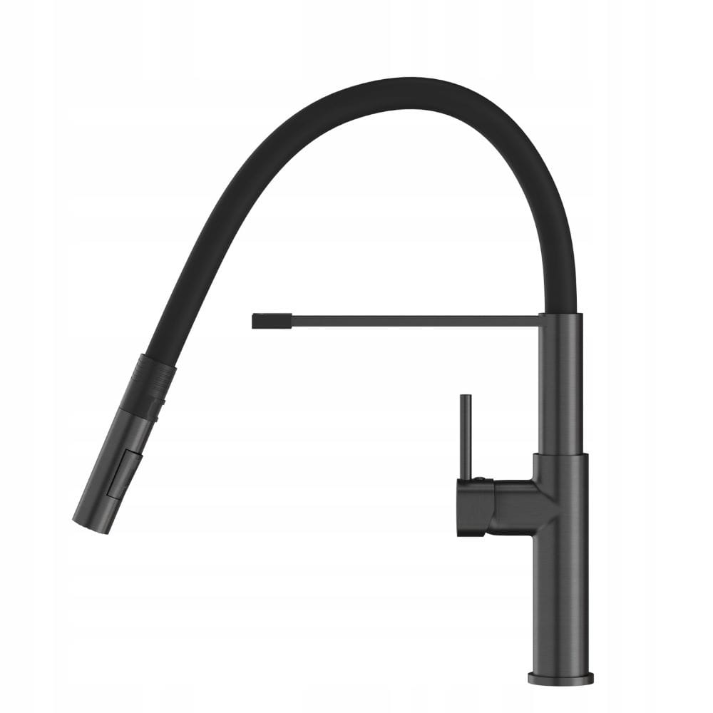 Kran Soria, w kolorze czarny metalik, wyposażony w elastyczną, wyciąganą wylewką, to innowacyjne rozwiązanie, które oferuje ponadprzeciętną wygodę podczas codziennych obowiązków kuchennych. Giętka wylewka pozwala na kierowanie strumienia wody w różnych kierunkach, dzięki czemu można łatwo dotrzeć do trudno dostępnych miejsc w zlewie, naczyniach, a nawet dużych garnkach i patelniach. Korpus baterii wyposażony jest w magnes, który pomaga nakierować i umieścić wylewkę w odpowiednim miejscu. Kolejną zaletą modelu Soria jest dwufunkcyjna słuchawka, która w zależności od potrzeb, może emitować klasyczny lub natryskowy strumień wody.