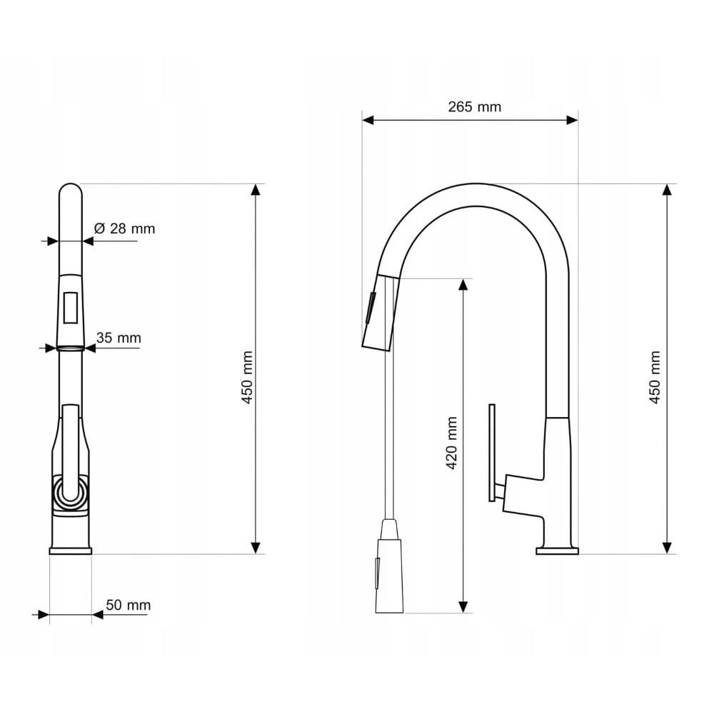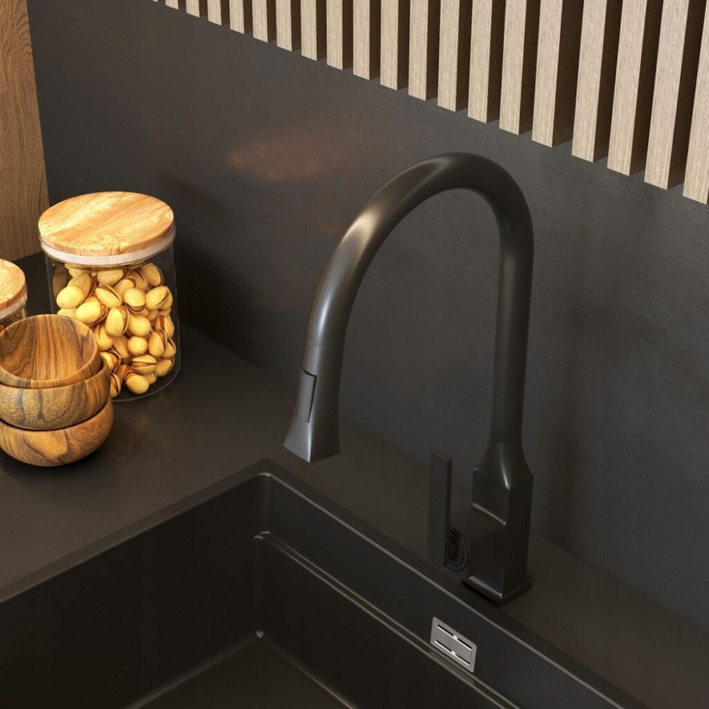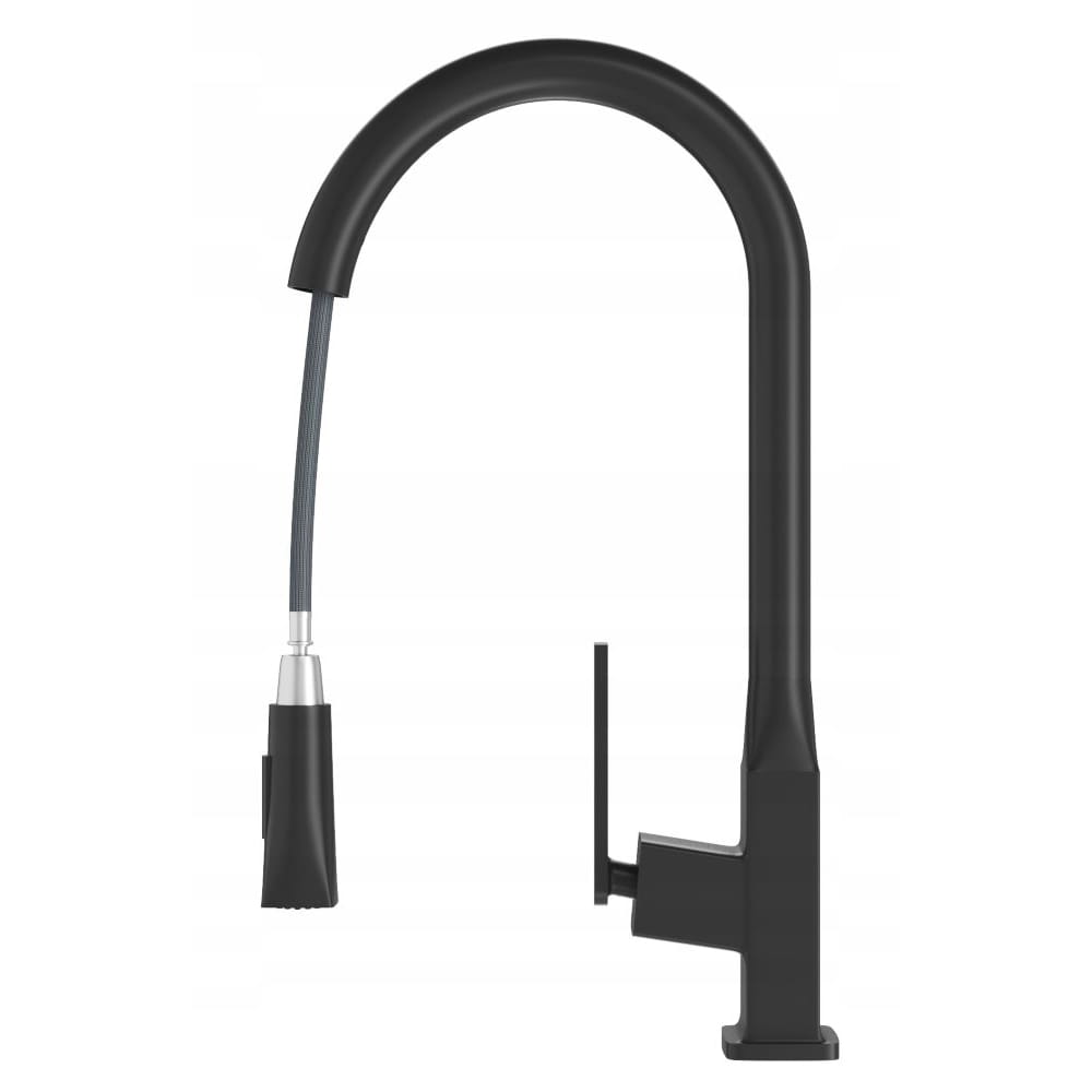 Paso to model nowoczesnej baterii z wyciąganą wylewką i dwufunkcyjną słuchawką, która bezapelacyjnie ułatwia i zdecydowanie podnosi komfort pracy w kuchni. Długa, ruchoma wylewka pozwala na sprawne mycie wielkogabarytowych naczyń, a także skierowanie wody w dowolny zakamarek zlewozmywaka. Kran posiada dwufunkcyjną słuchawkę, która w zależności od potrzeb, może emitować standardowy bądź prysznicowy strumień. Model wykonany jest z trwałego i odpornego mosiądzu, a jego barwa (czarny mat) idealnie współgra z aktualnymi trendami i jest spójna z wieloma aranżacjami kuchennymi.