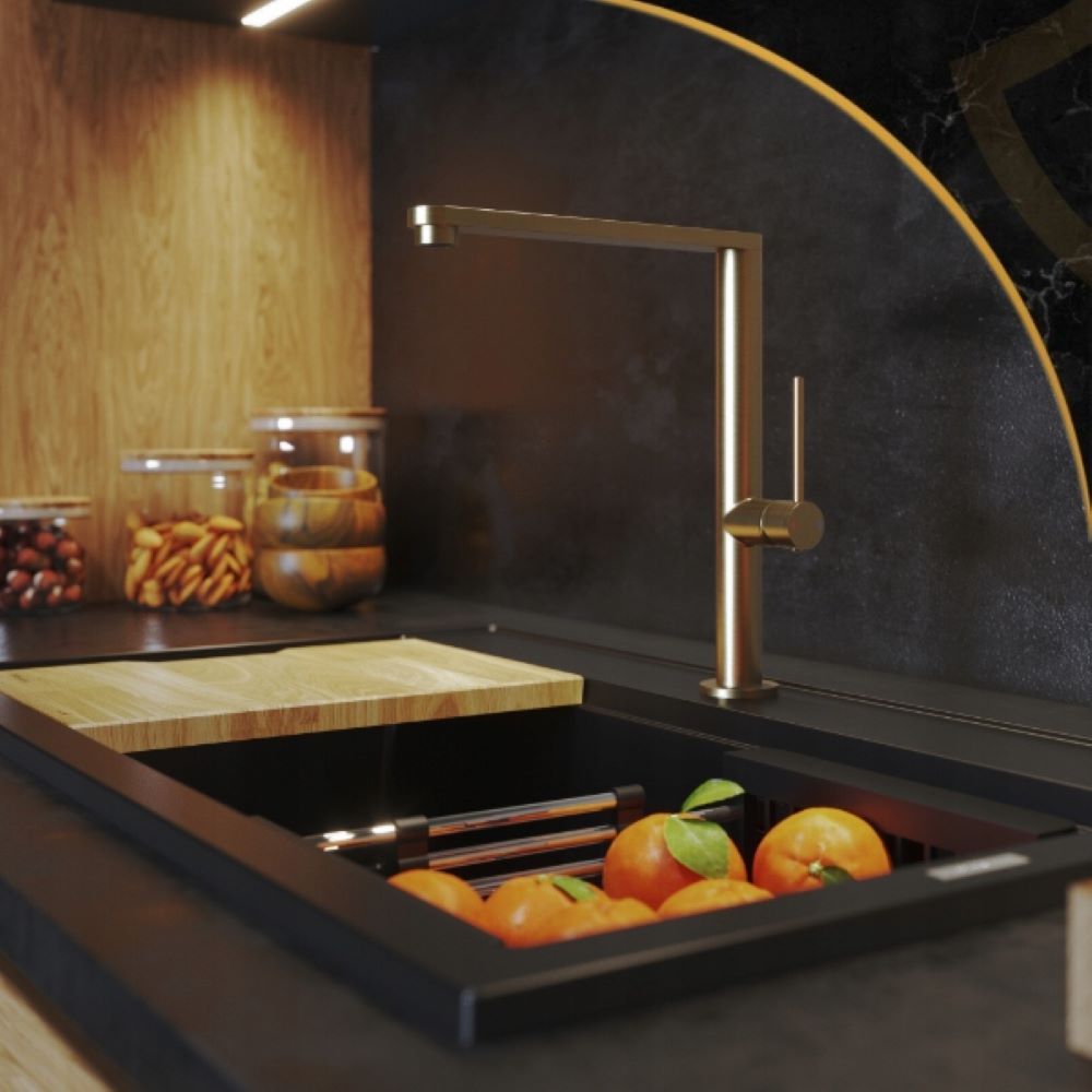 Bateria kuchenna VELMO Granitan to połączenie stylu i funkcjonalności. Jej smukła, geometryczna forma i eleganckie wykończenie sprawiają, że doskonale wpisuje się zarówno w kuchnie w stylu nowoczesnym, loftowym, jak i skandynawskim. Wylewka obraca się w zakresie 360 stopni, co zwiększa komfort użytkowania, zwłaszcza przy dwukomorowych zlewach. Dzięki zastosowaniu perlatora bateria ogranicza przepływ wody, nie zmniejszając komfortu użytkowania. To ekologiczne i ekonomiczne rozwiązanie.