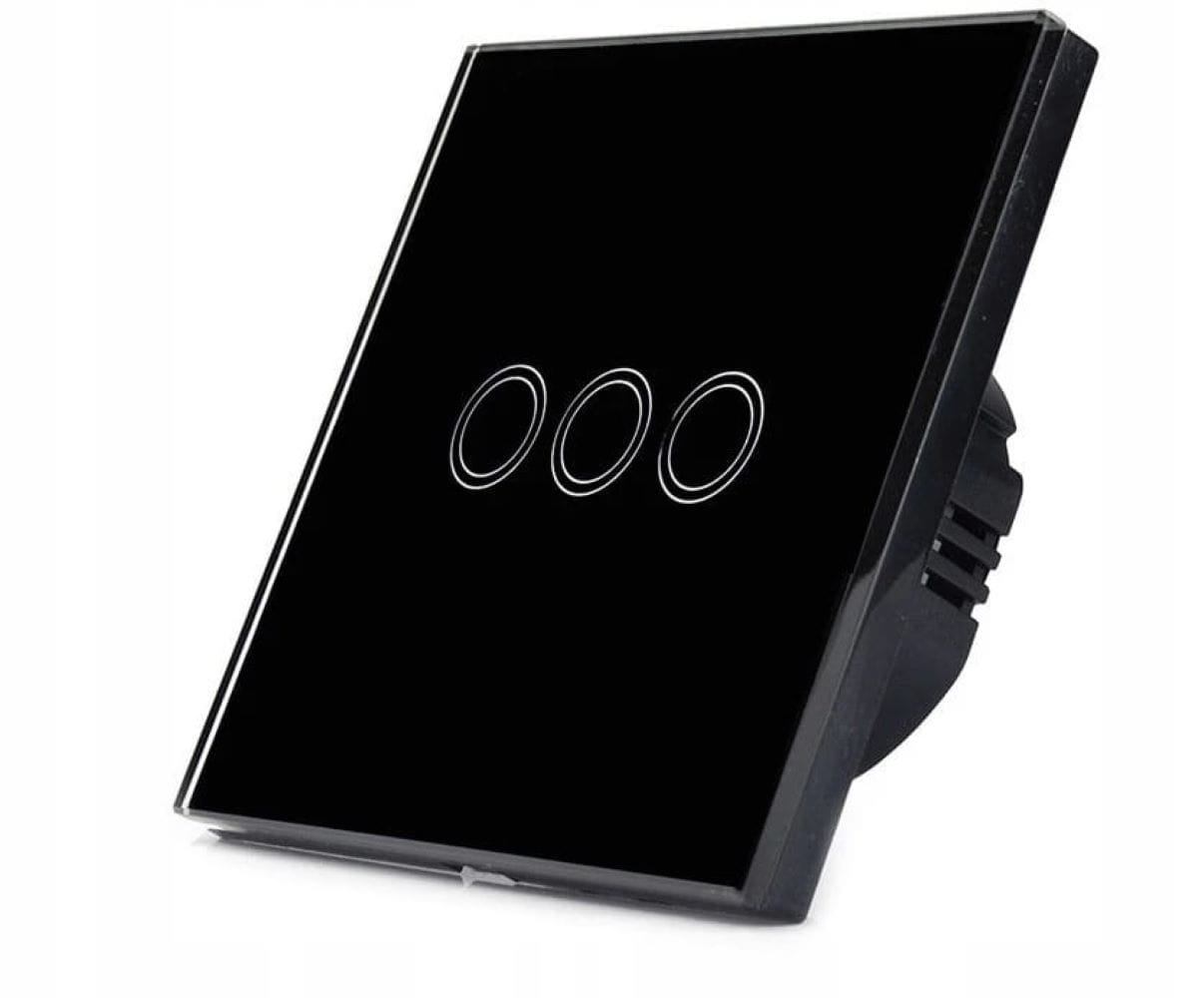 Potrójny włącznik dotykowy, szklany w kolorze białym/czarnym z możliwością sterowania pilotem (WiFi). Panel zostały wykony ze wzmocnionego szkła, odpornego na odbarwienia. Powierzchnia łatwa w czyszczeniu. Element dotykowy jest bardzo czuły, gdy jest wyłączony podświetla się na niebiesko. Do zestawu dołączony jest adapter LED, który pozwala zastosować włącznik nawet dla lamp z diodami LED. Włącznik pasuje do standardowej puszki okrągłej 60 mm. Możliwość sterowania światłem za pomocą pilota (dostępny na osobnej aukcji) lub aplikacji na telefon (m.in. Tuya Smart).