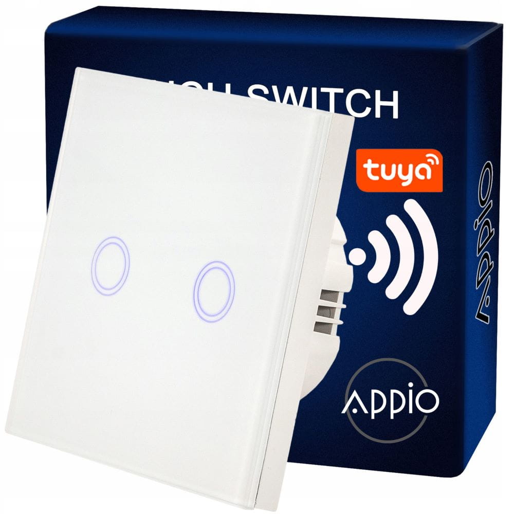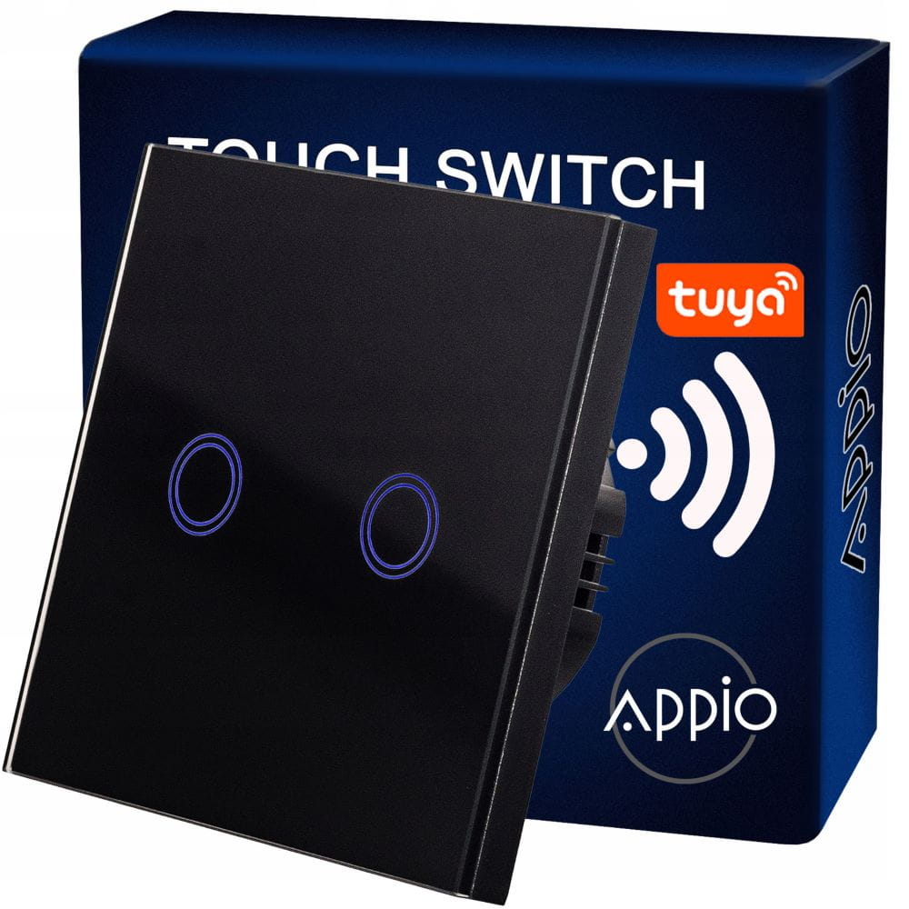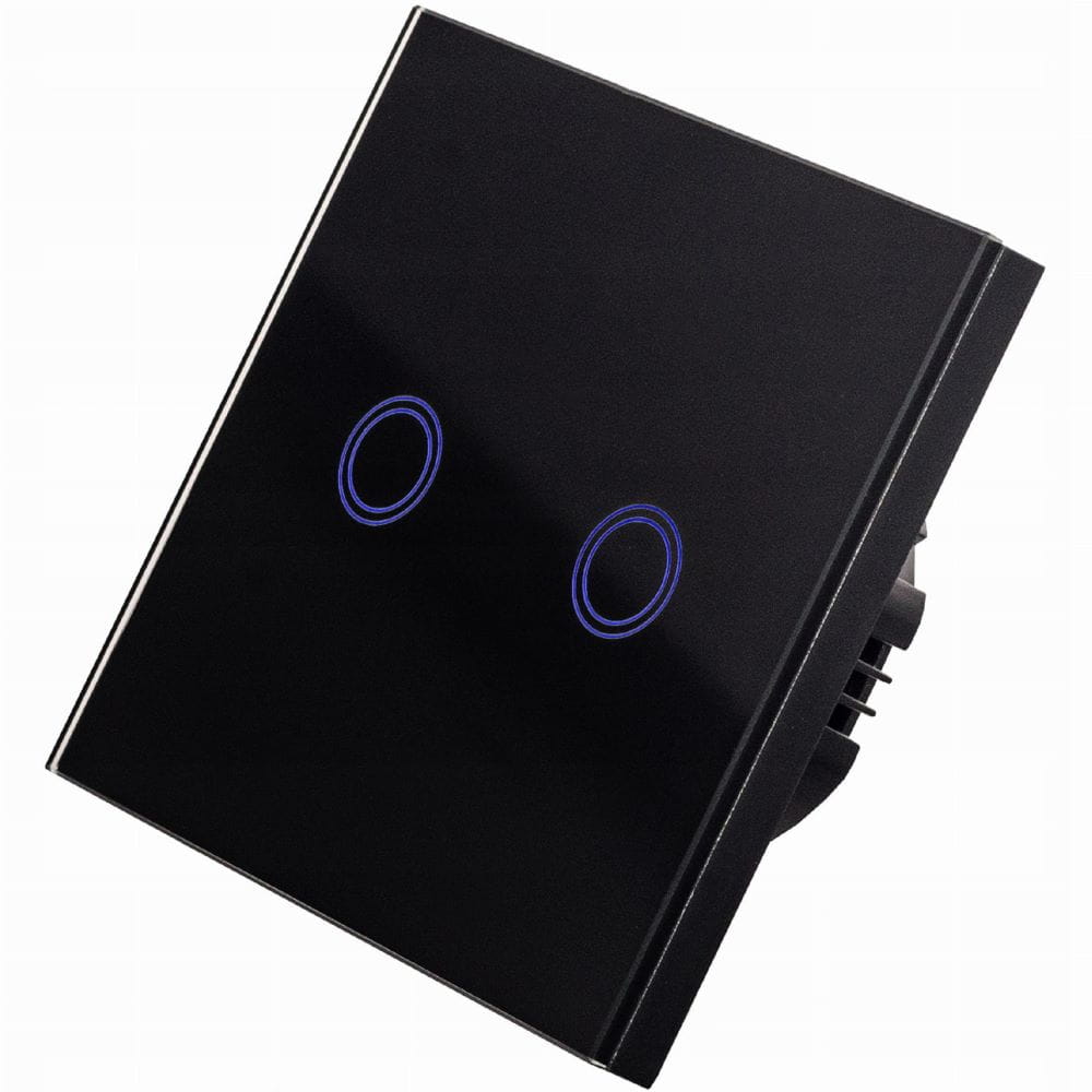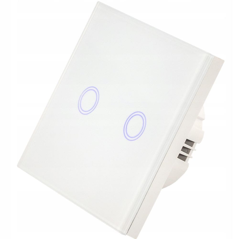 Podwójny włącznik dotykowy, szklany w kolorze białym/czarnym z możliwością sterowania pilotem (WiFi). Panel zostały wykony ze wzmocnionego szkła, odpornego na odbarwienia. Powierzchnia łatwa w czyszczeniu. Element dotykowy jest bardzo czuły, gdy jest wyłączony podświetla się na niebiesko. Do zestawu dołączony jest adapter LED, który pozwala zastosować włącznik nawet dla lamp z diodami LED. Włącznik pasuje do standardowej puszki okrągłej 60 mm.
