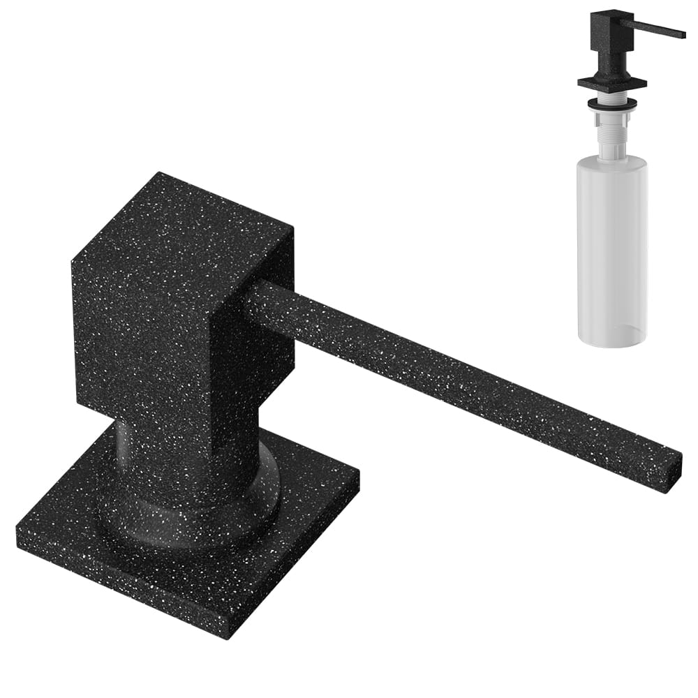 Dozownik dla płynu do mycia naczyń lub mydła. Korpus wykonany stali nierdzewnej, natomiast pojemnik na płyn z tworzywa PCV. Dostępny w 7 kolorach. Dedykowany do zlewozmywaka w kolorze całym czarnym lub czarnym nakrapianym. Wpasowujący się także w inne kolory wedle indywidualnych preferencji.