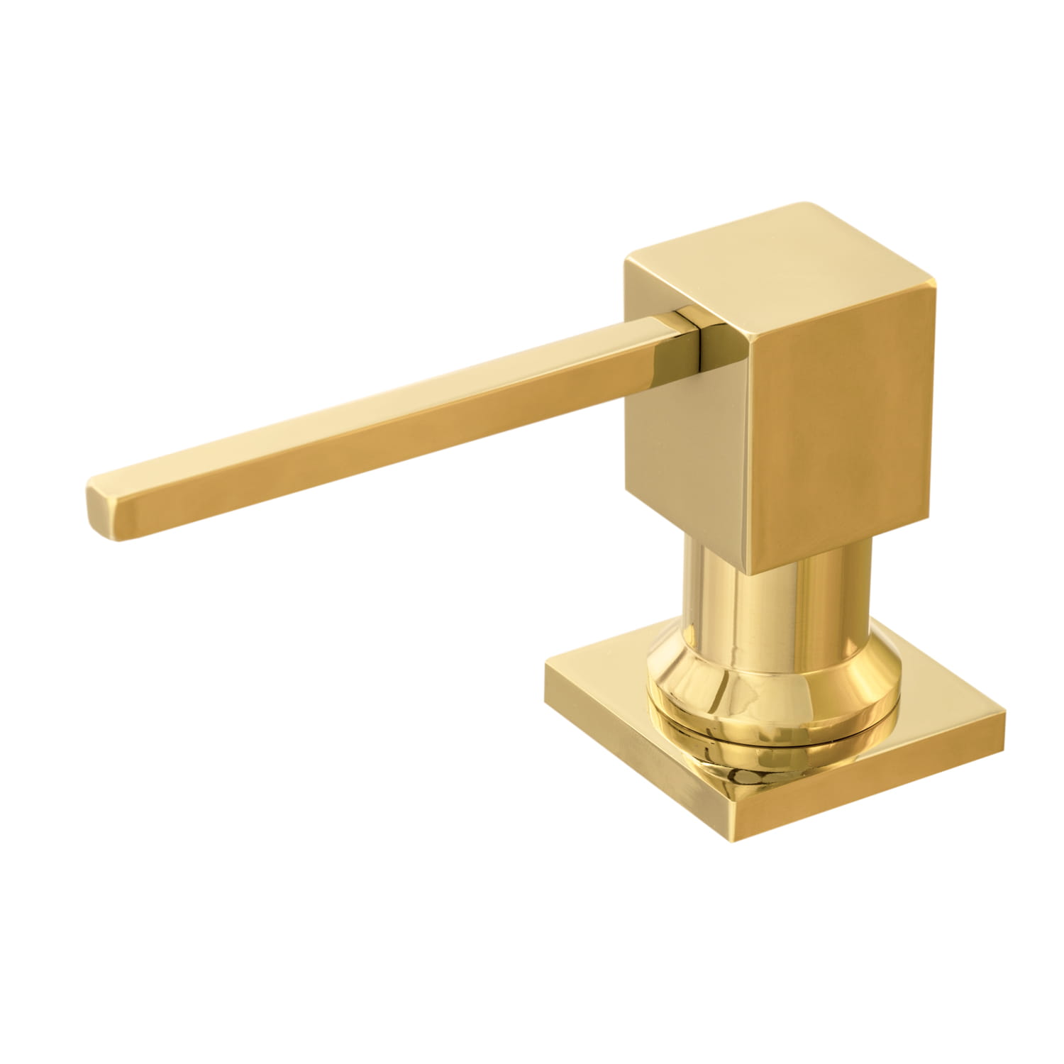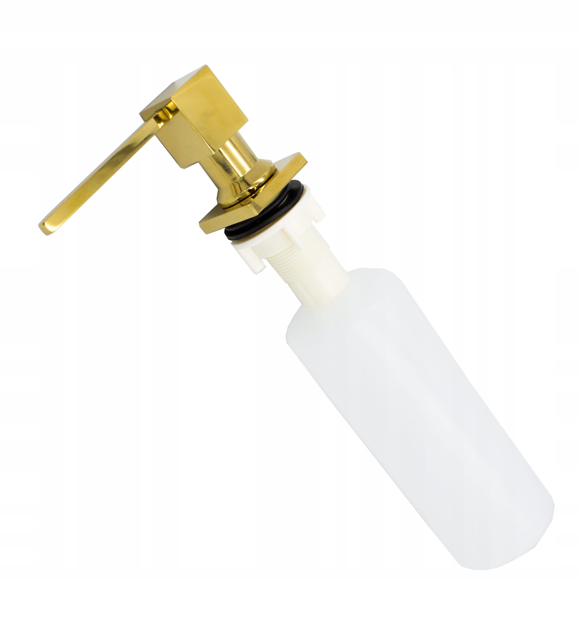 Dozownik kwadratowy do zlewozmywaka wykonany ze stali szlachetnej i tworzywa PCV, w kolorze złotym. Napełniany od góry. Obrotowa końcówka 360'. Łatwy w montażu. Uzupełnienie poprzez wyjęcie pompki, nie wymaga odkręcania pojemnika.