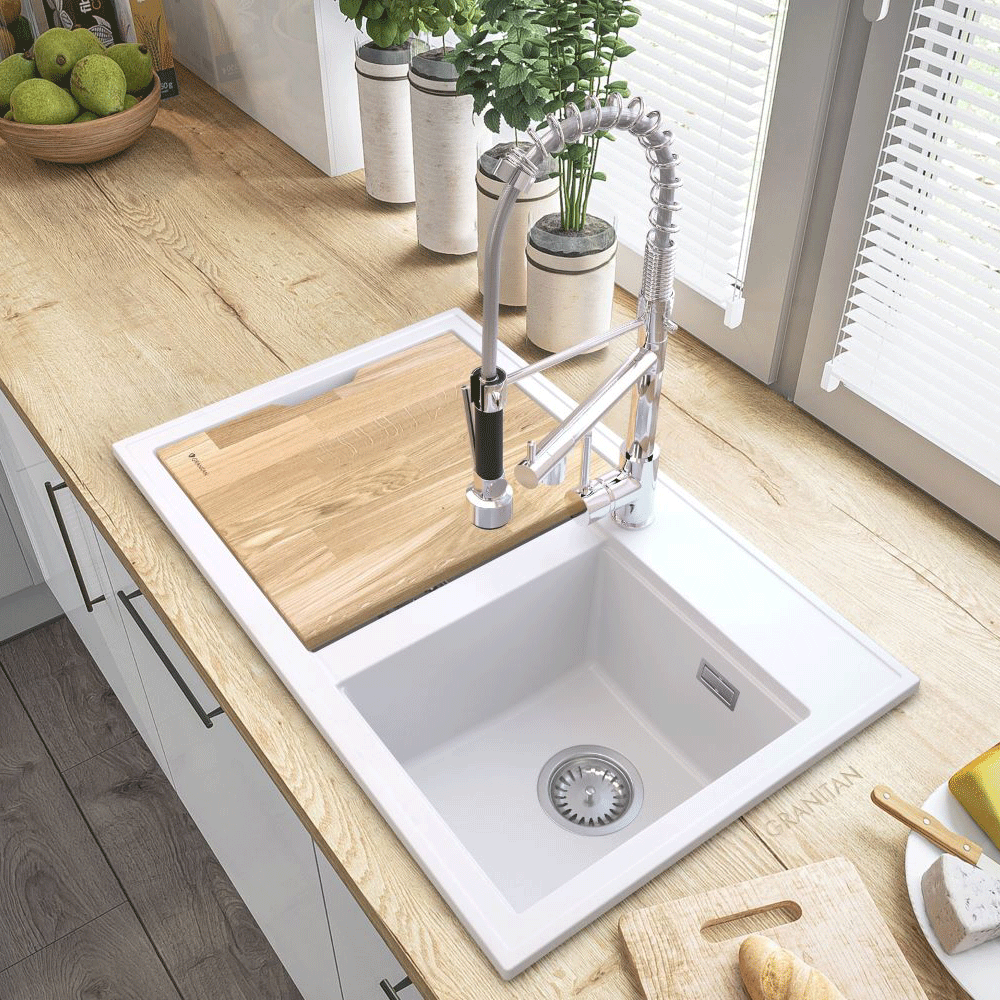 Górne krawędzie zlewów LOUIS i HEKTOR posiadają dodatkowe wyżłobienie i są przeznaczone na dedykowaną deskę kuchenną, która ułatwi zmywanie i zwiększy komfort podczas codziennych czynności. Produkt wykonany z lameli bukowych łączonych na mikrowczep. Deska została zabezpieczona naturalnym olejem lnianym. W ten sposób uzyskaliśmy deskę o wysokiej odporności mechanicznej i zminimalizowaliśmy wpływ warunków zewnętrznych takich jak wilgoć i woda. Zarówno rozmiar, jak i kształt zostały dopasowane stylistycznie do zlewu, by razem tworzył spójną, elegancją i funkcjonalną całość.
