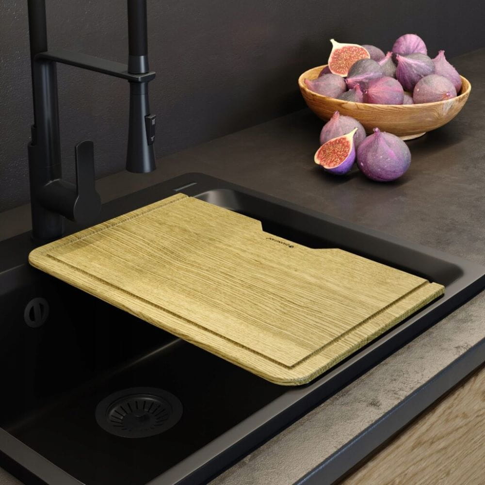 Dedykowana deska drewniana jest praktycznym, a zarazem estetycznym uzupełnieniem zlewozmywaka i przestrzeni kuchennej. Produkt wykonany z naturalnego drewna dębowego. Drewno posiada naturalne właściwości bakteriobójcze, dlatego odpowiednio pielęgnowana deska może posłużyć przez wiele lat. Jej naturalna powierzchnia sprawia, że nie tępi noży. W przeciwieństwie do produktów plastikowych (w których nacięcia sprzyjają rozwojowi bakterii) drewniane deski mają zdolność do zasklepiania drobnych nacięć na powierzchni co sprawia, że są bardzo trwałe. Zarówno rozmiar, jak i kształt zostały dopasowane stylistycznie do zlewu, by razem tworzyć spójny, elegancki i funkcjonalny zestaw. Produkt posiada silikonowe podkładki, które zabezpieczają deskę przed przesuwaniem się podczas pracy.