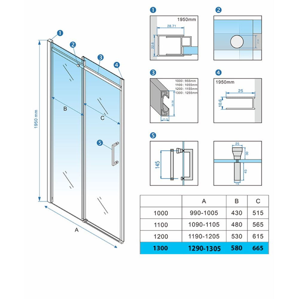 Istnieje możliwość dostosowania długości drzwi prysznicowych do mniejszych rozmiarów nawet o 50 mm! Należy skrócić profil górny samodzielnie TYLKO I WYŁĄCZNIE od strony drzwi (szyny po której jeżdżą rolki, poprzez jej ucięcie na dowolną długość).
