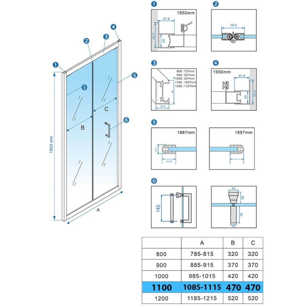 Zestaw zawiera: szyby z technologią NANO GLASS o grubości 6 mm, aluminiowe profile z regulacją 20 mm, stalowe rączki, uszczelki oraz śruby montażowe.