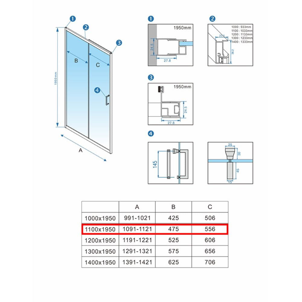 Istnieje możliwość dostosowania długości drzwi prysznicowych do mniejszych rozmiarów nawet o 50 mm! Należy skrócić profil górny samodzielnie TYLKO I WYŁĄCZNIE od strony drzwi (szyny po której jeżdżą rolki, poprzez jej ucięcie na dowolną długość).