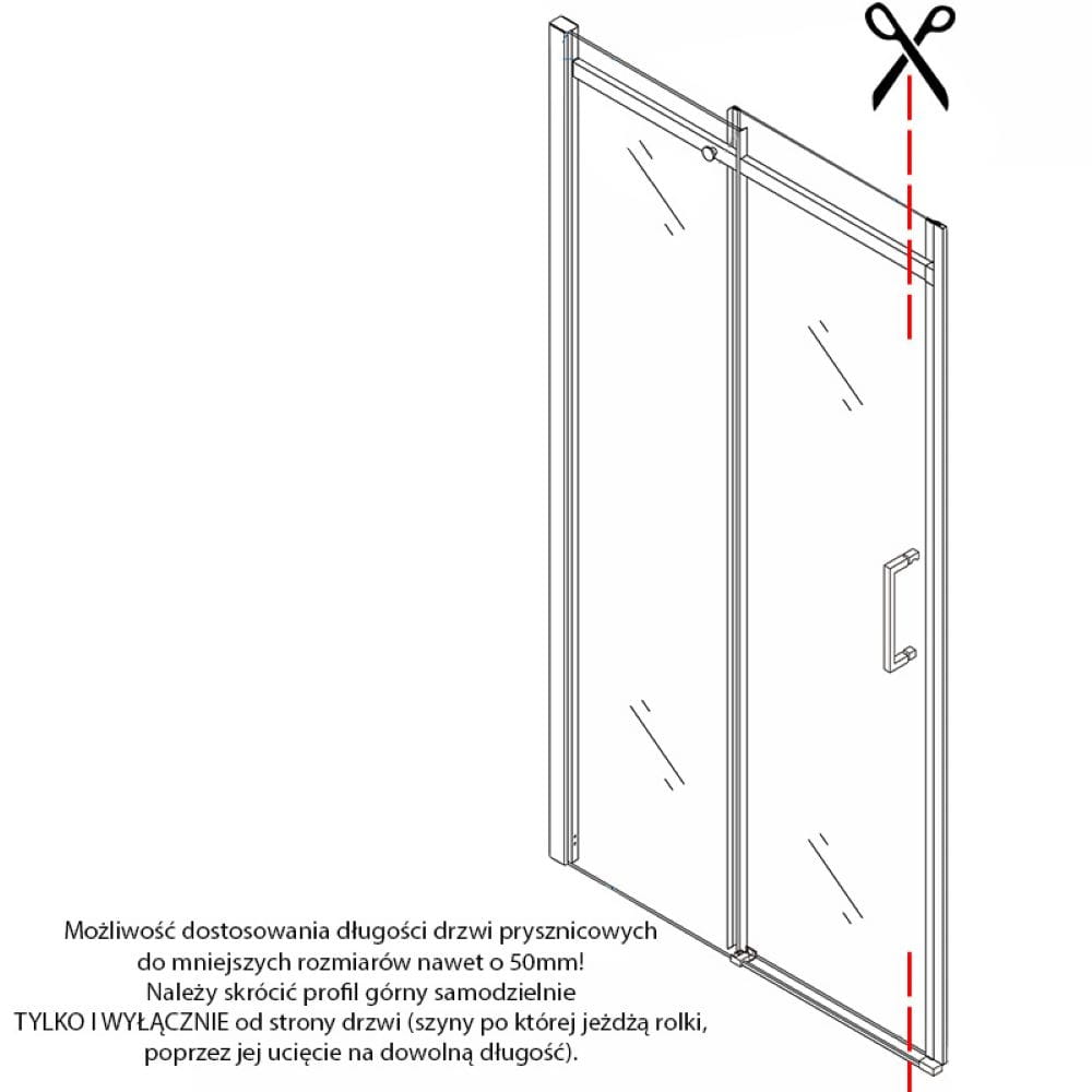 Istnieje możliwość dostosowania długości drzwi prysznicowych do mniejszych rozmiarów nawet o 50 mm! Należy skrócić profil górny samodzielnie TYLKO I WYŁĄCZNIE od strony drzwi (szyny po której jeżdżą rolki, poprzez jej ucięcie na dowolną długość).