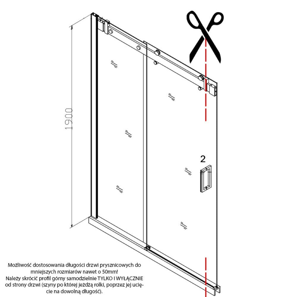 Istnieje możliwość dostosowania długości drzwi prysznicowych do mniejszych rozmiarów nawet o 50 mm! Należy skrócić profil górny samodzielnie TYLKO I WYŁĄCZNIE od strony drzwi (szyny po której jeżdżą rolki, poprzez jej ucięcie na dowolną długość).
