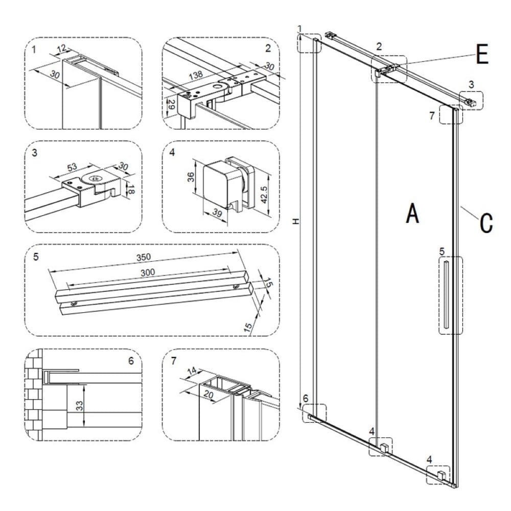 Zestaw zawiera: szyby z technologią NANO GLASS o grubości 8 mm, aluminiowe profile z regulacją 15 mm oraz stalowe rolki.