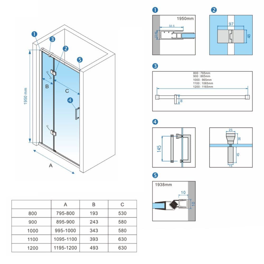 Zestaw zawiera: szyby z technologią NANO GLASS o grubości 6 mm, aluminiowe profile z regulacją 5 mm, podwójne stalowe rączki, aluminiową listwę progową, komplet wysokiej jakości uszczelek, komplet śrub montażowych oraz stalowe zawiasy posiadające ciche zamykanie drzwi "Soft closing".