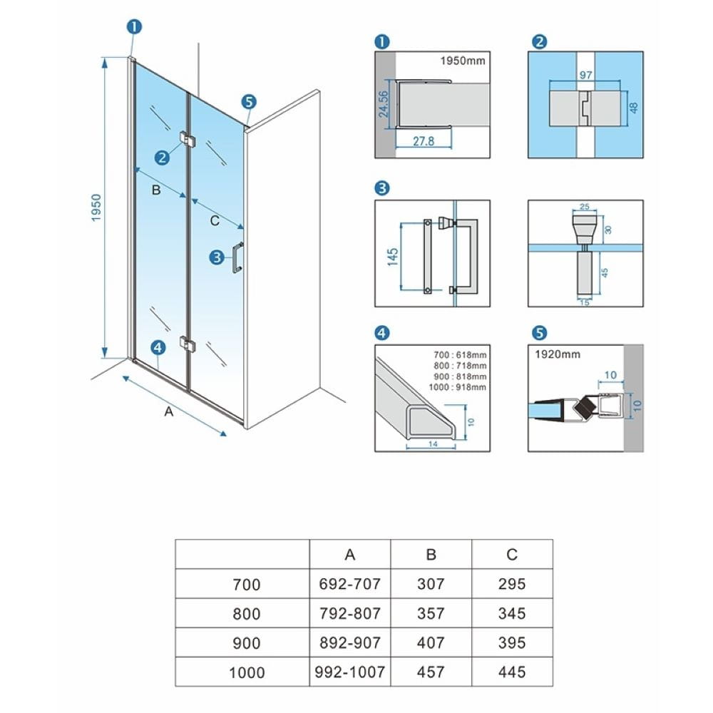 Zestaw zawiera: szyby z technologią NANO GLASS o grubości 6 mm, aluminiowe profile z regulacją 15 mm, podwójne stalowe rączki, aluminiową listwę progową, komplet wysokiej jakości uszczelek, komplet śrub montażowych, stalowe zawiasy posiadające ciche zamykanie drzwi "Soft closing" do szyb oraz uszczelkę magnetyczną. Kabina posiada system unoszenia drzwi podczas ich otwierania UP/DOWN.