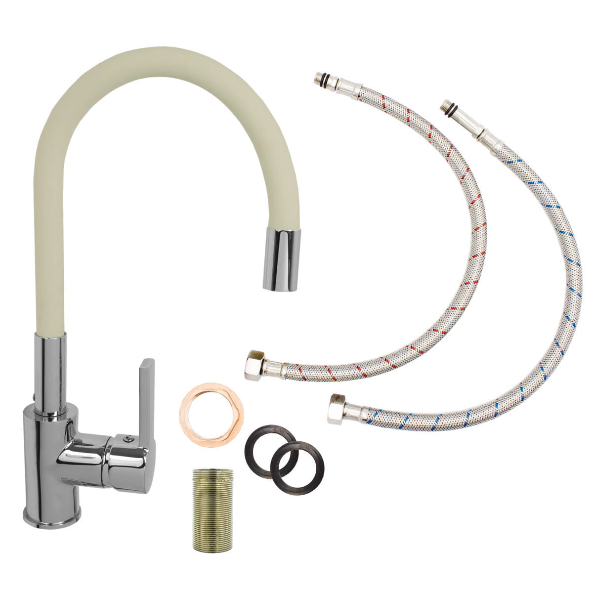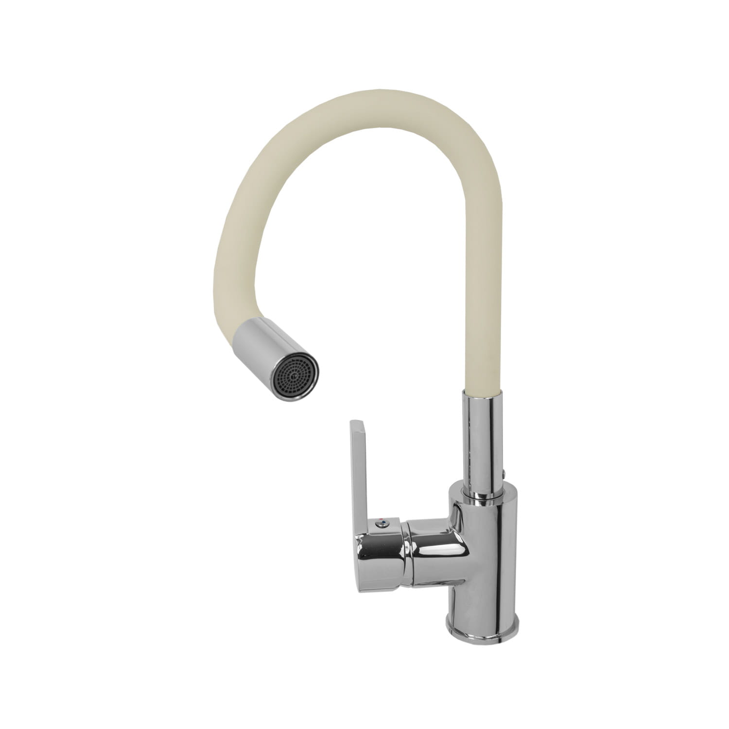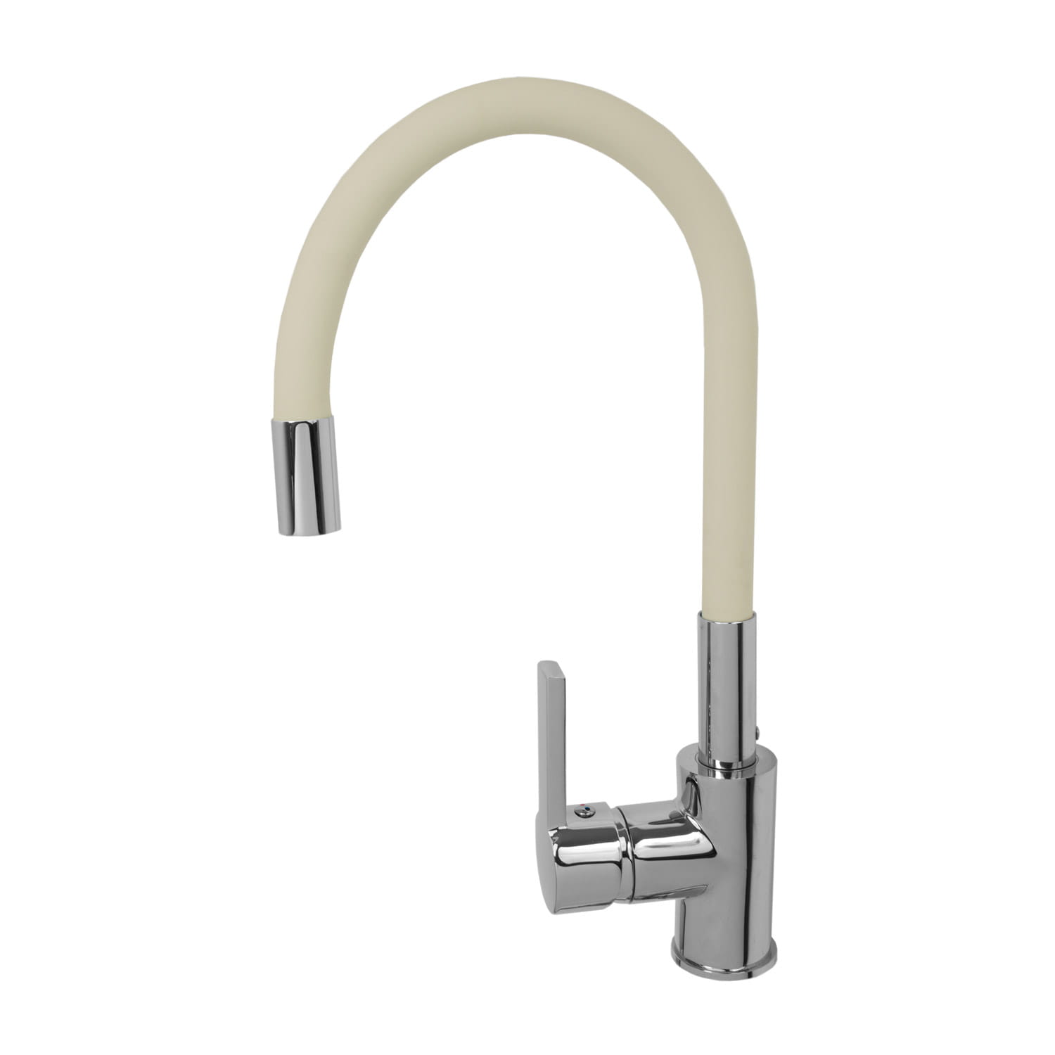 Bateria kuchenna z elastyczną wylewką o wysokiej jakości, wykonana z mosiądzu, w kolorze beżowym z elementami chromu. Powłoka baterii odporna na przebarwienia i wysoką temperaturę, ceramiczna głowica. Obrotowa wylewka 360'. Wymienny perlator m24. Standardowy otwór montażowy 35 mm.