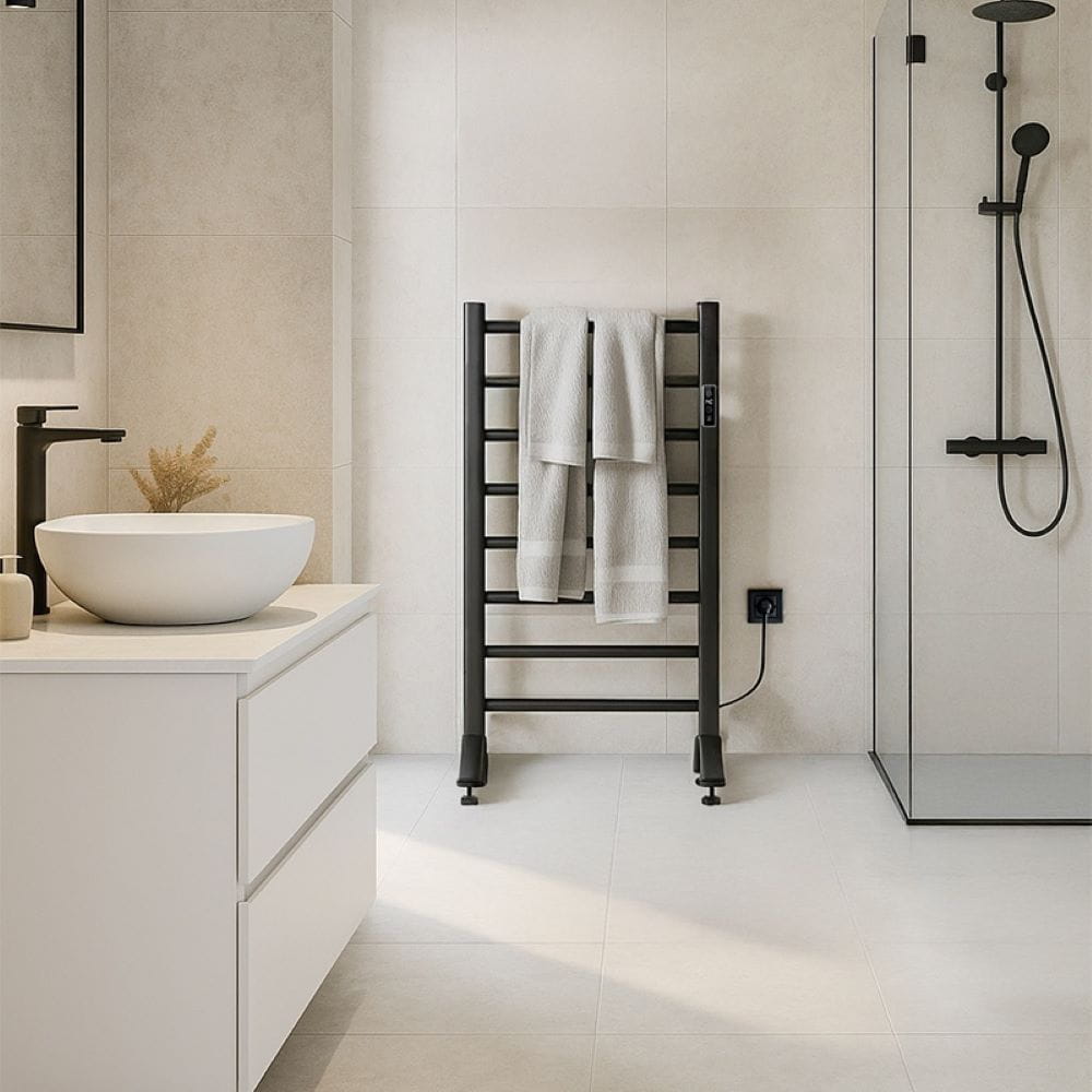 ● Stylowy wygląd – Nowoczesna forma, czarna powłoka i smukła konstrukcja sprawiają, że grzejnik doskonale prezentuje się w każdej łazience – to elegancki dodatek do wnętrza.