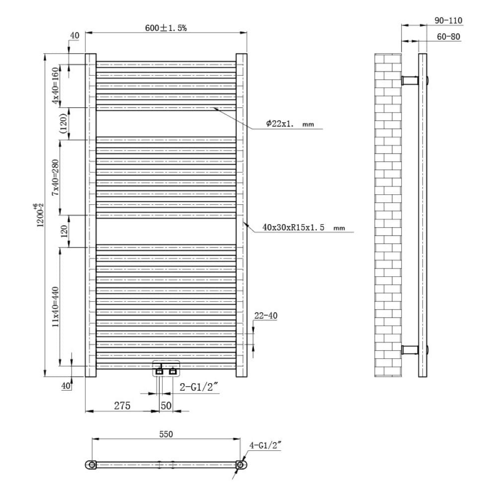 Elastyczne możliwości montażu  Dzięki czterem przyłączom G1/2” i rozstawowi 55 cm oraz dwóm przyłączom G1/2” w dolnej środkowej części, grzejnik można zamontować zarówno po lewej, jak i prawej stronie, co znacznie ułatwia dopasowanie do istniejącej instalacji.