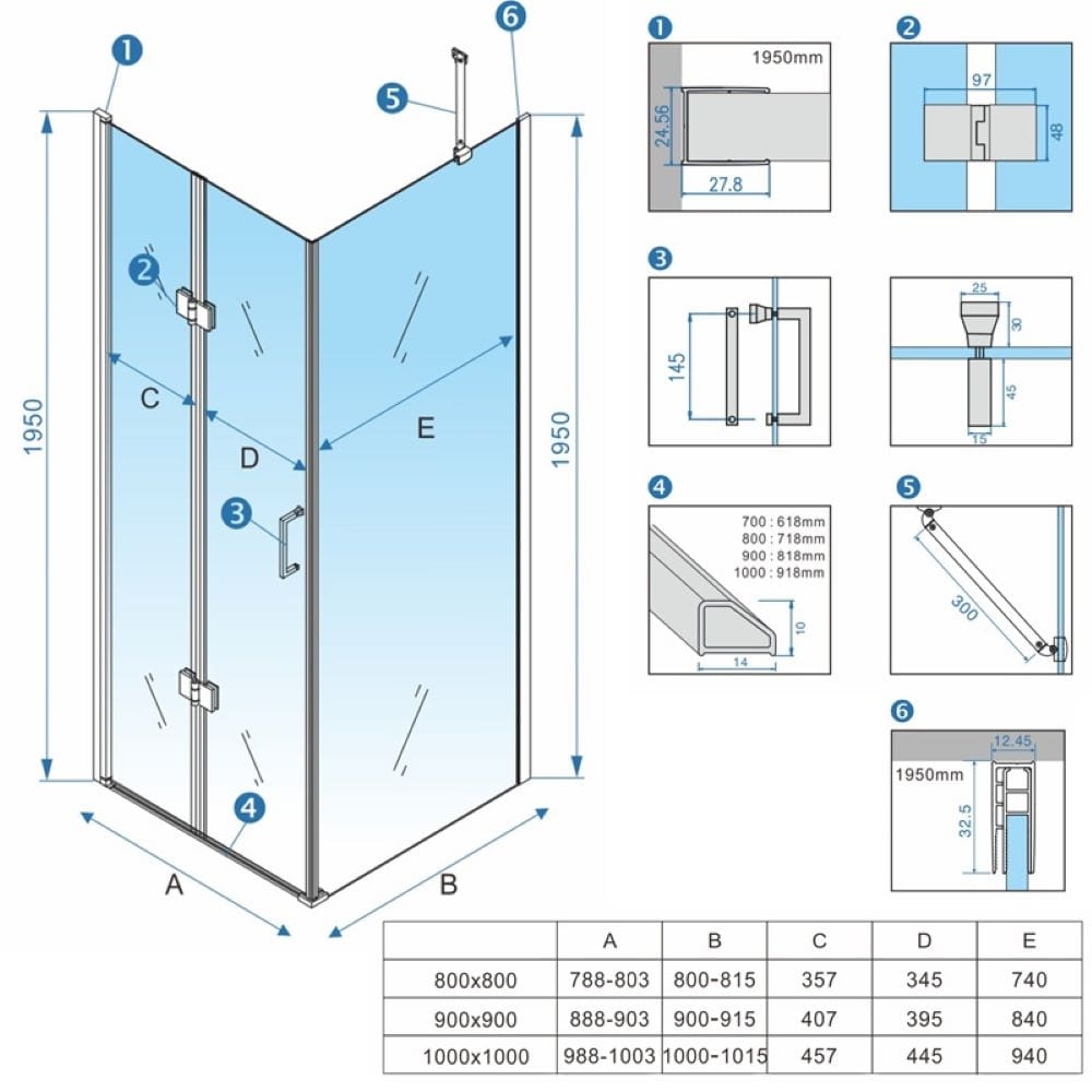 Zestaw zawiera: szyby z technologią NANO GLASS o grubości 6 mm, aluminiowe profile z regulacją 15 mm, podwójne stalowe rączki, aluminiową listwę progową, komplet wysokiej jakości uszczelek, komplet śrub montażowych, stalowe zawiasy posiadające ciche zamykanie drzwi "Soft closing" oraz uszczelkę magnetyczną. Kabina posiada system unoszenia drzwi podczas ich otwierania UP/DOWN.