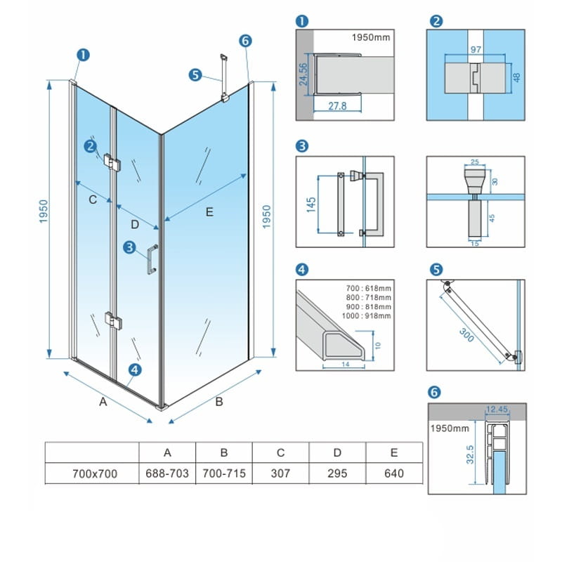 Zestaw zawiera: szyby z technologią NANO GLASS o grubości 6 mm, aluminiowe profile z regulacją 15 mm, podwójne stalowe rączki, aluminiową listwę progową, komplet wysokiej jakości uszczelek, komplet śrub montażowych, stalowe zawiasy posiadające ciche zamykanie drzwi "Soft closing" oraz uszczelkę magnetyczną. Kabina posiada system unoszenia drzwi podczas ich otwierania UP/DOWN.