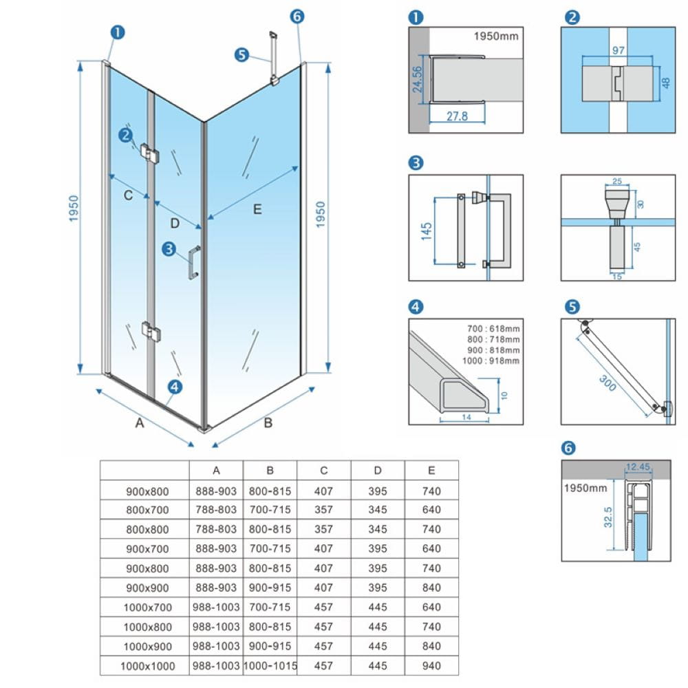 Zestaw zawiera: szyby z technologią NANO GLASS o grubości 6 mm, aluminiowe profile z regulacją 15 mm, podwójne stalowe rączki, aluminiową listwę progową, komplet wysokiej jakości uszczelek, komplet śrub montażowych, stalowe zawiasy posiadające ciche zamykanie drzwi "Soft closing" oraz uszczelkę magnetyczną. Kabina posiada system unoszenia drzwi podczas ich otwierania UP/DOWN.