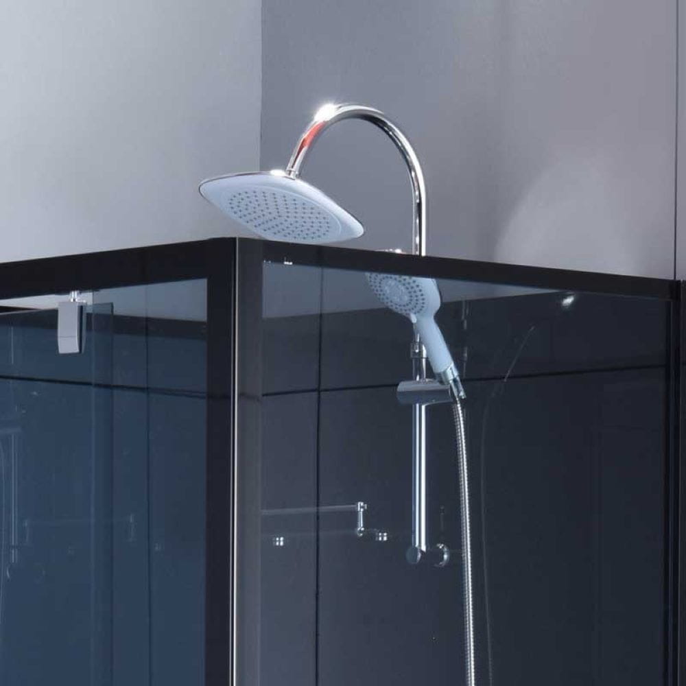 Zestaw zawiera: bezpieczne hartowane szkło o grubości 5 mm, zestaw prysznicowy, przełącznik zmiany intensywności wody, regulator ciepłej/zimnej wody, półka na przybory kosmetyczne, uszczelki, klamki do otwierania oraz brodzik.