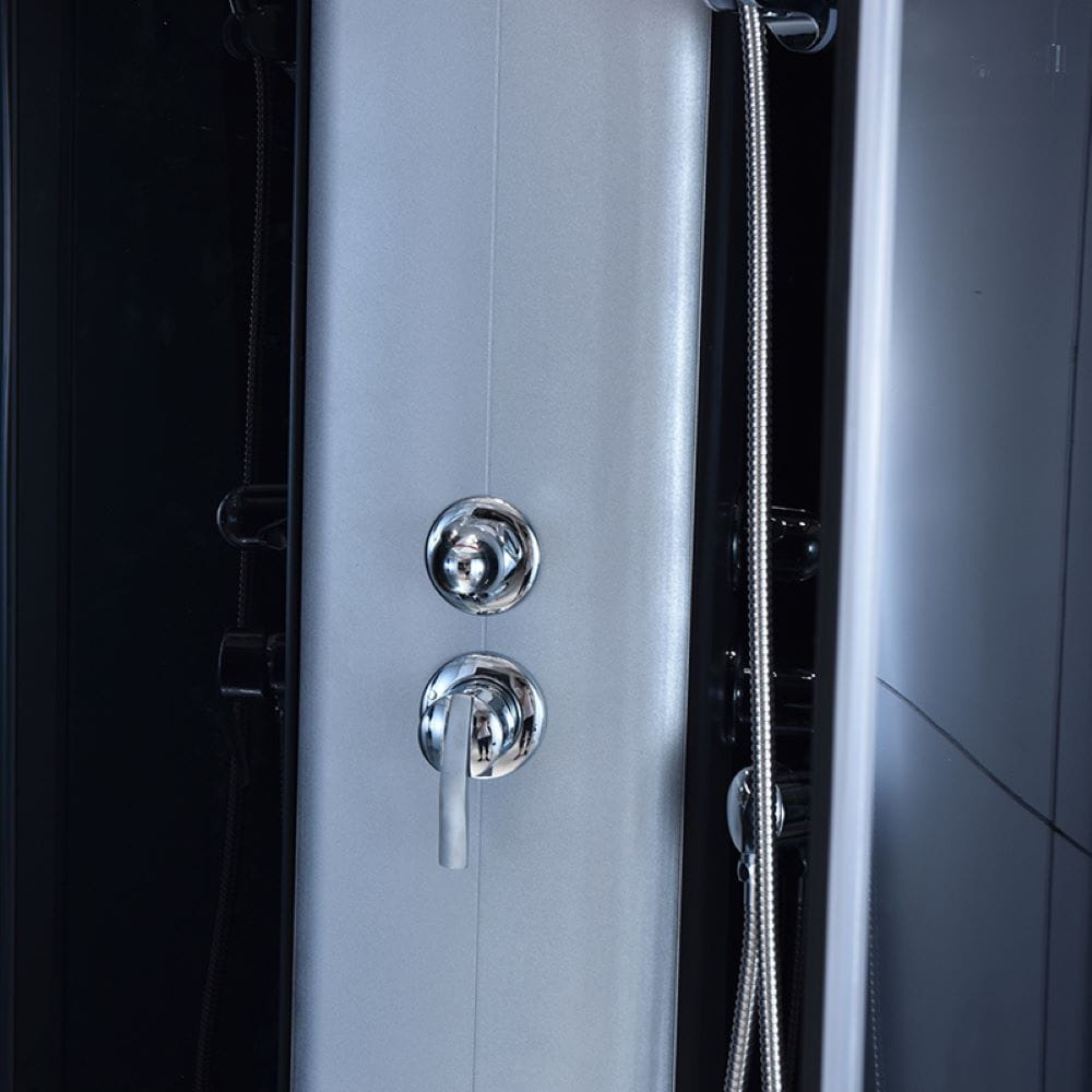 Zestaw zawiera: bezpieczne hartowane szkło o grubości 5 mm, zestaw prysznicowy, przełącznik zmiany intensywności wody, regulator ciepłej/zimnej wody, półka na przybory kosmetyczne, uszczelki, klamki do otwierania oraz brodzik.