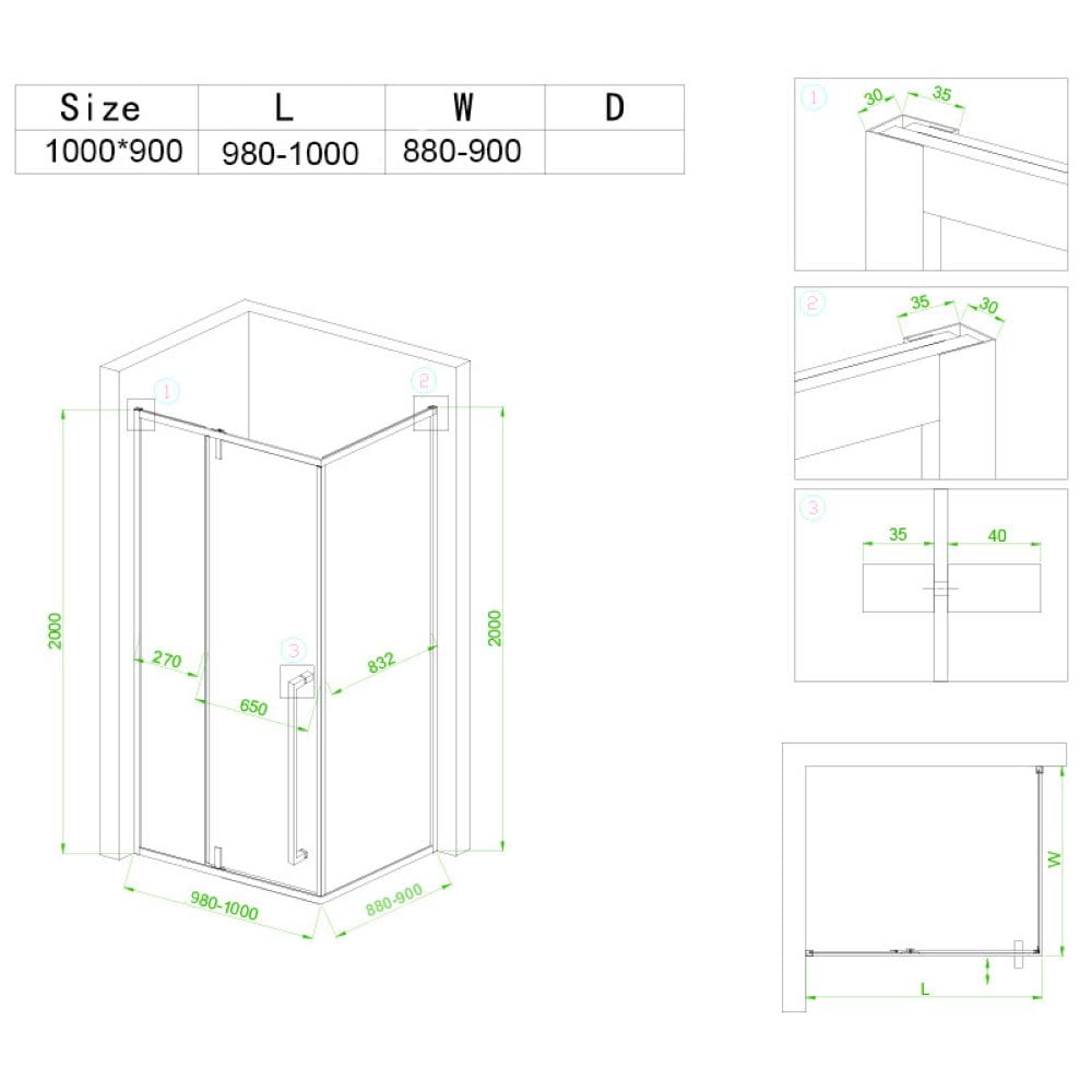Zestaw zawiera: szyby z technologią NANO GLASS o grubości 6 mm, aluminiowe profile z regulacją 20 mm, uchwyt do otwierania ze stali nierdzewnej, aluminiową listwę progową, komplet wysokiej jakości uszczelek, komplet śrub montażowych, stalowe zawiasy posiadające ciche zamykanie drzwi "Soft closing" oraz uszczelkę magnetyczną.