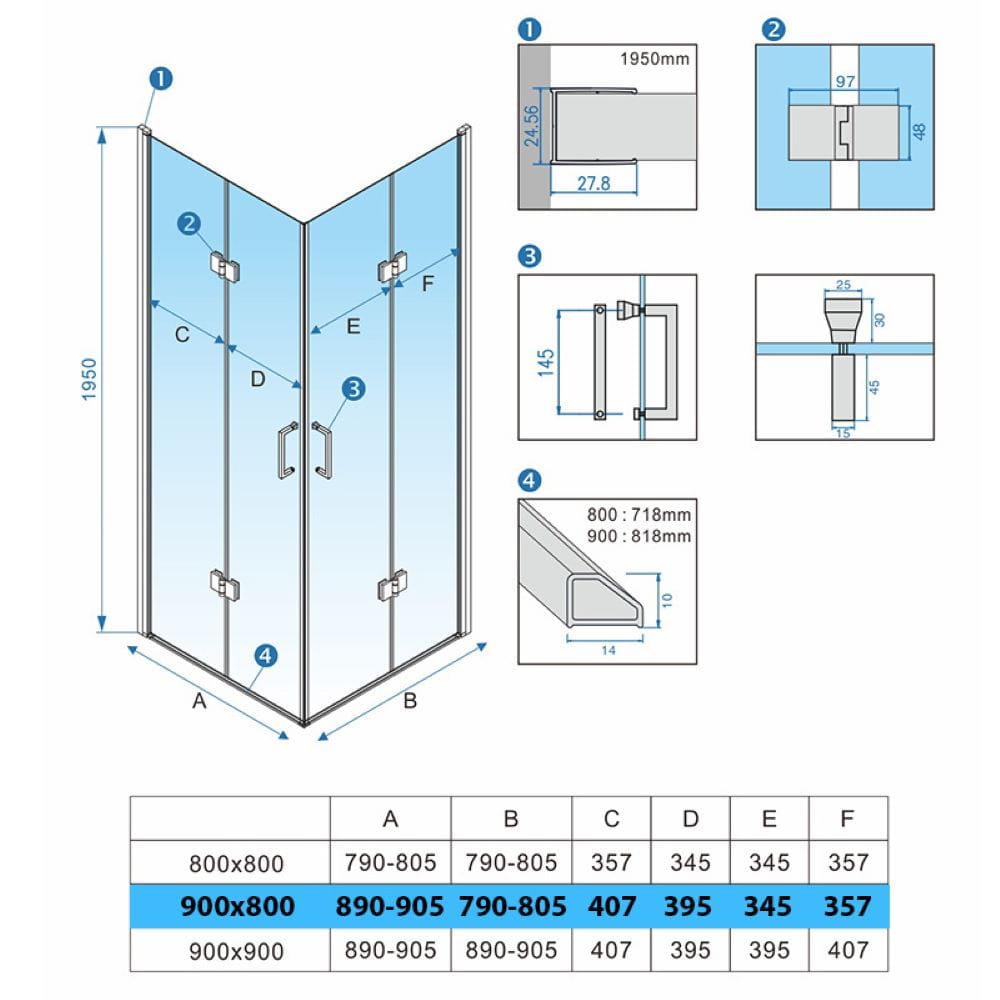 Zestaw zawiera: szyby z technologią NANO GLASS o grubości 6 mm, aluminiowe profile z regulacją 15 mm, podwójne stalowe rączki, aluminiową listwę progową, komplet wysokiej jakości uszczelek, komplet śrub montażowych, stalowe zawiasy posiadające ciche zamykanie drzwi "Soft closing" oraz uszczelkę magnetyczną. Kabina posiada system unoszenia drzwi podczas ich otwierania UP/DOWN.
