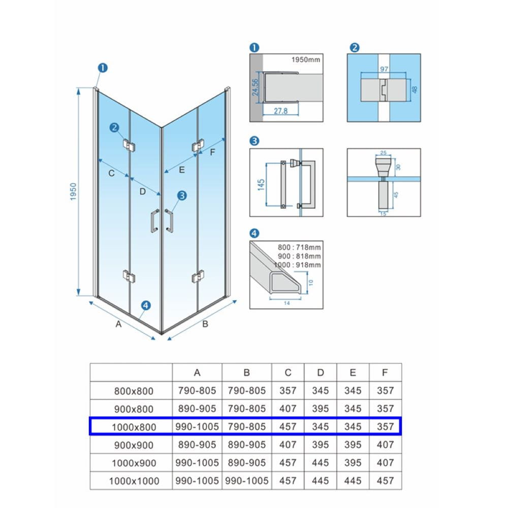 Zestaw zawiera: szyby z technologią NANO GLASS o grubości 6 mm, aluminiowe profile z regulacją 15 mm, stalowe rączki, zestaw uszczelek, śruby montażowe, aluminiowy próg oraz zawiasy do szyb.