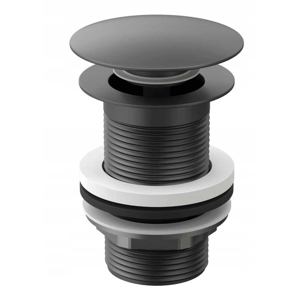 Korek klik klak do umywalki bez przelewu wykonany z mosiądzu, wysoka jakość, w kolorze czarny/mat. Pasuje do 99,9% umywalek. Gwint 1 1/4″. Rozmiary standardowe. Odporny na detergenty, zarysowania i wysoką temperaturę.