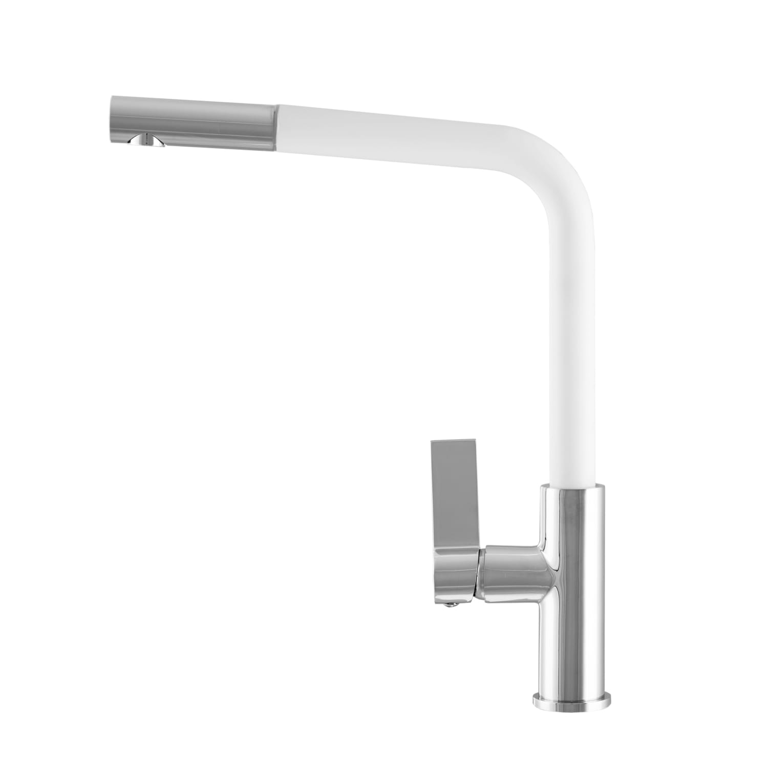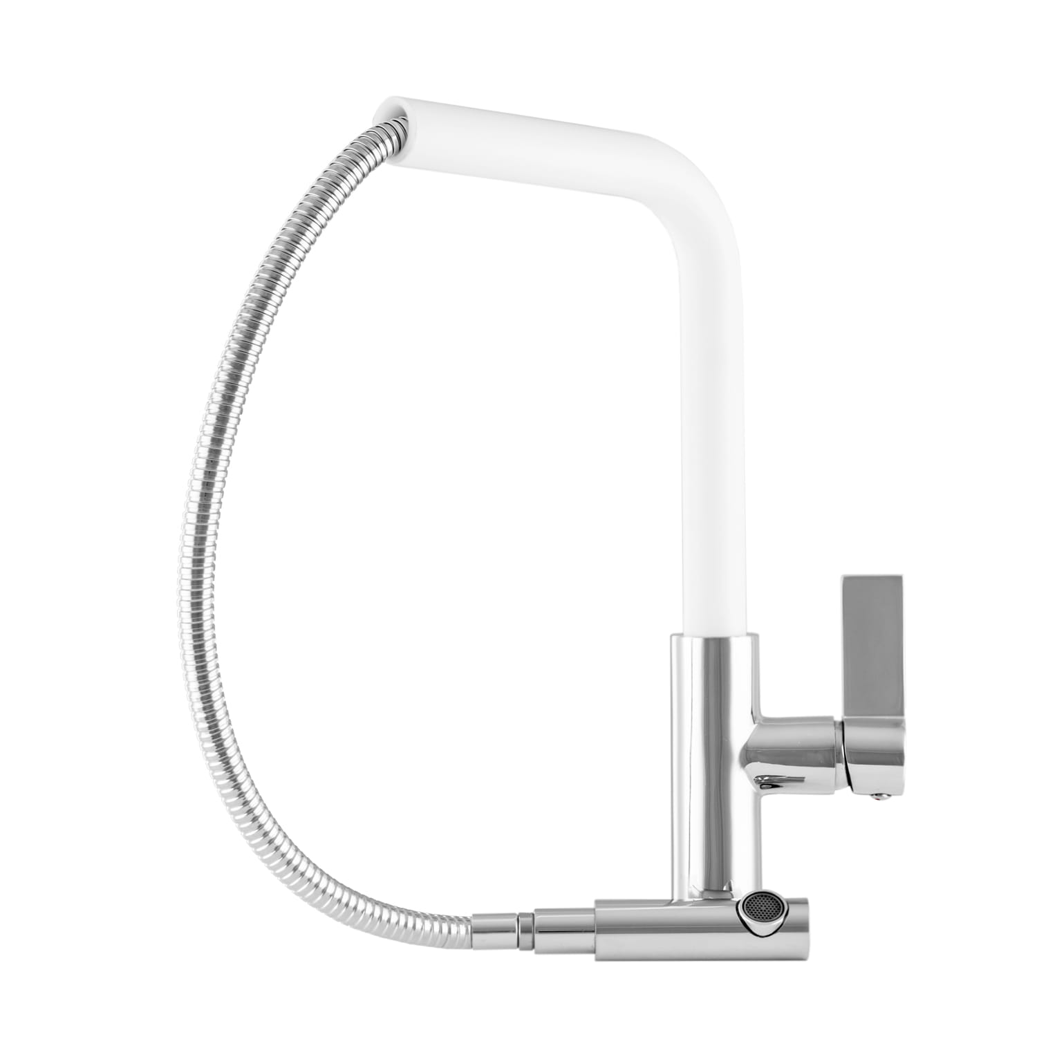 Line bateria kuchenna z wyciąganą wylewką o wysokiej jakości, wykonana z mosiądzu, w kolorze białym. Powłoka baterii odporna na przebarwienia i wysoką temperaturę. Ceramiczna głowica. Obrotowa 360', wyciągana wylewka. Standardowy otwór montażowy 35 mm.