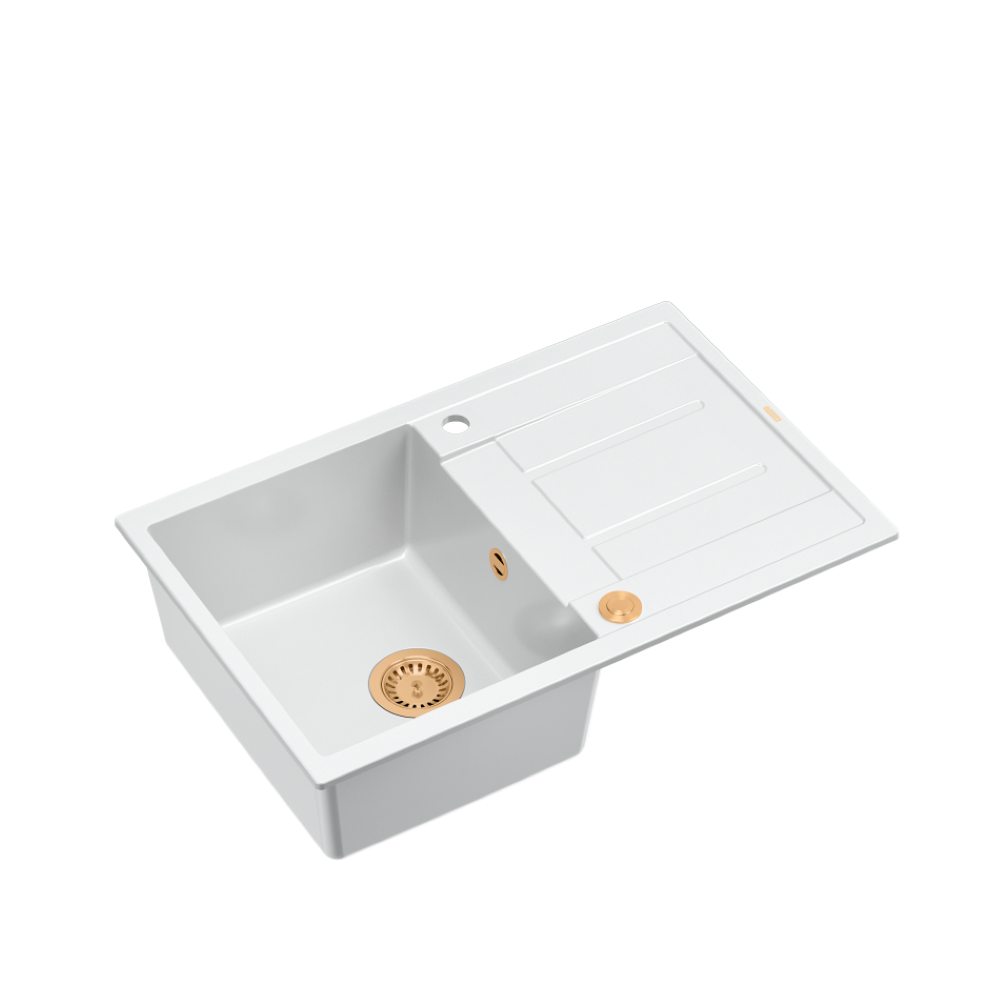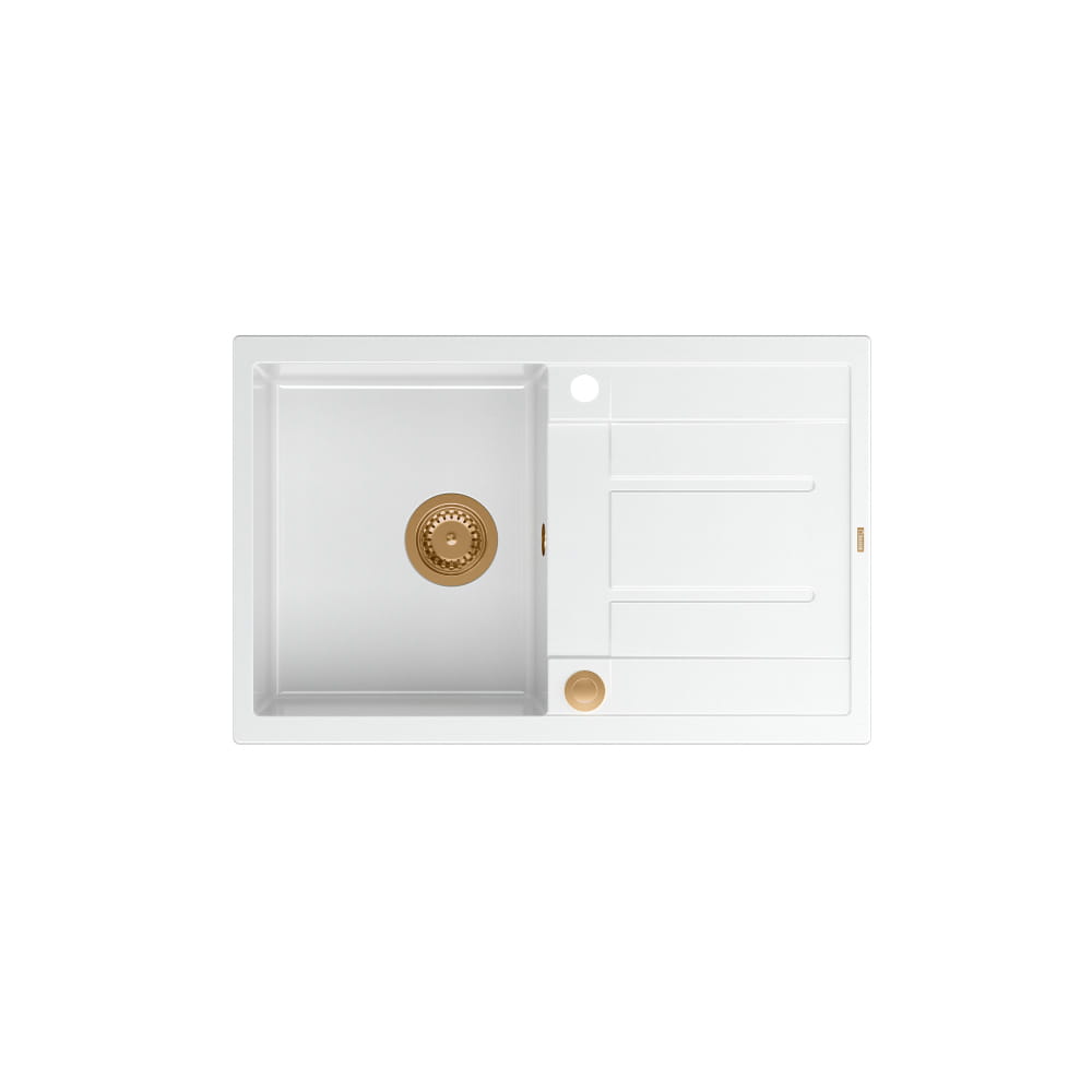Morgan 111 GraniteQ zlewozmywak snow white z syfonem Push To Open 1-komorowy z/o/ elementy miedziane/stal szlachetna/złoto