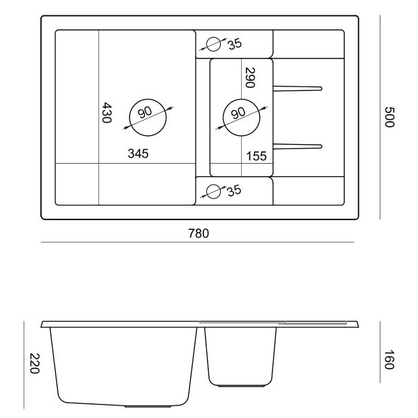 * Zlewozmywak posiada 2 punkty pod otwory (na baterię, dozownik etc.) o średnicy Ø35 mm.