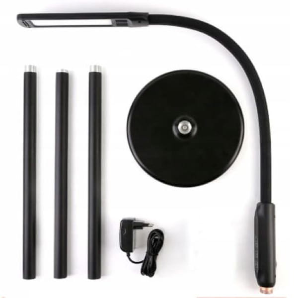 W zestawie: elastyczne ramię z źródłem światła, trzy drążki o długości 30 cm jeden - możemy dzięki nim skracać/wydłużać lampę, podstawa lampy, zasilacz oraz pilot zasilany 2x AAA (brak w zestawie).