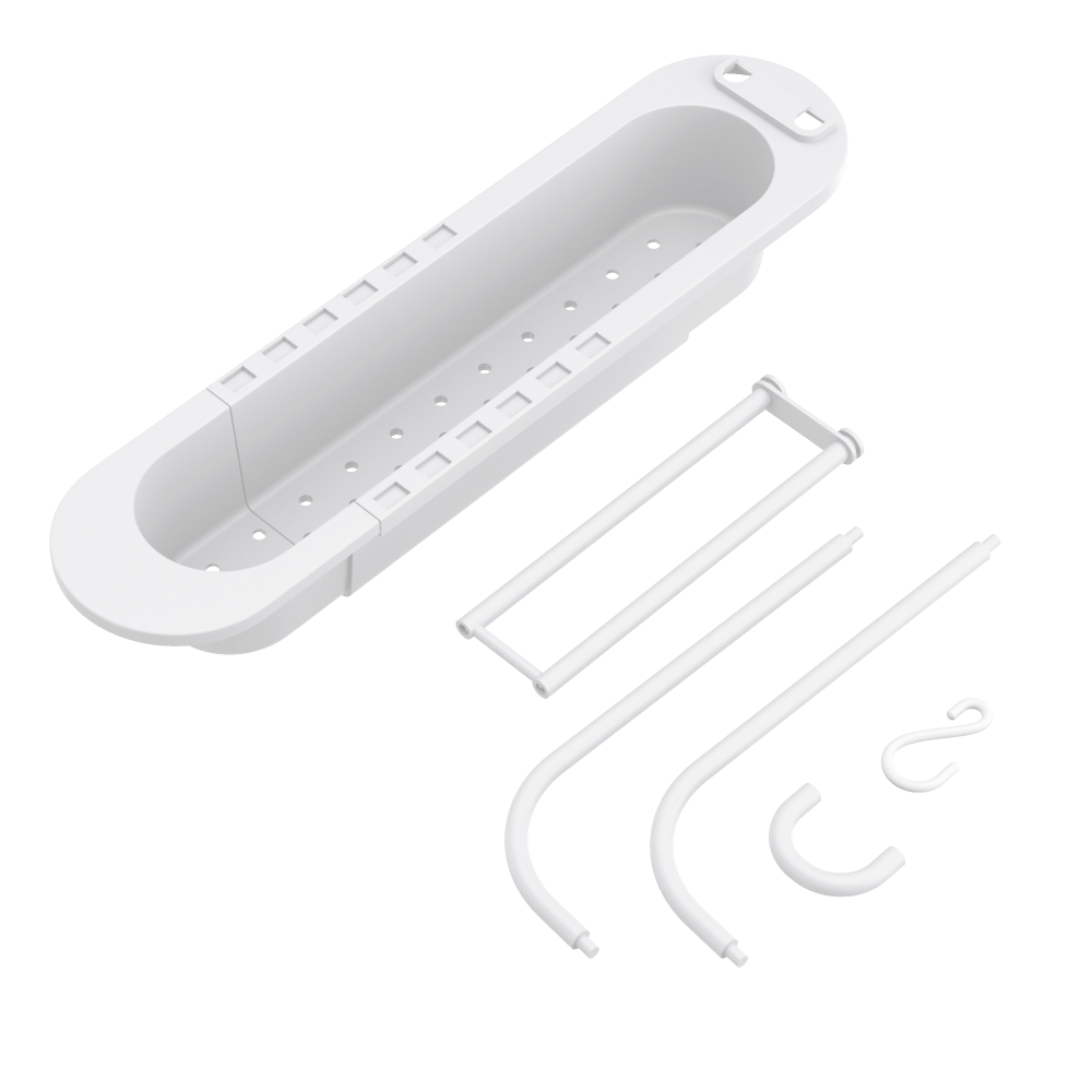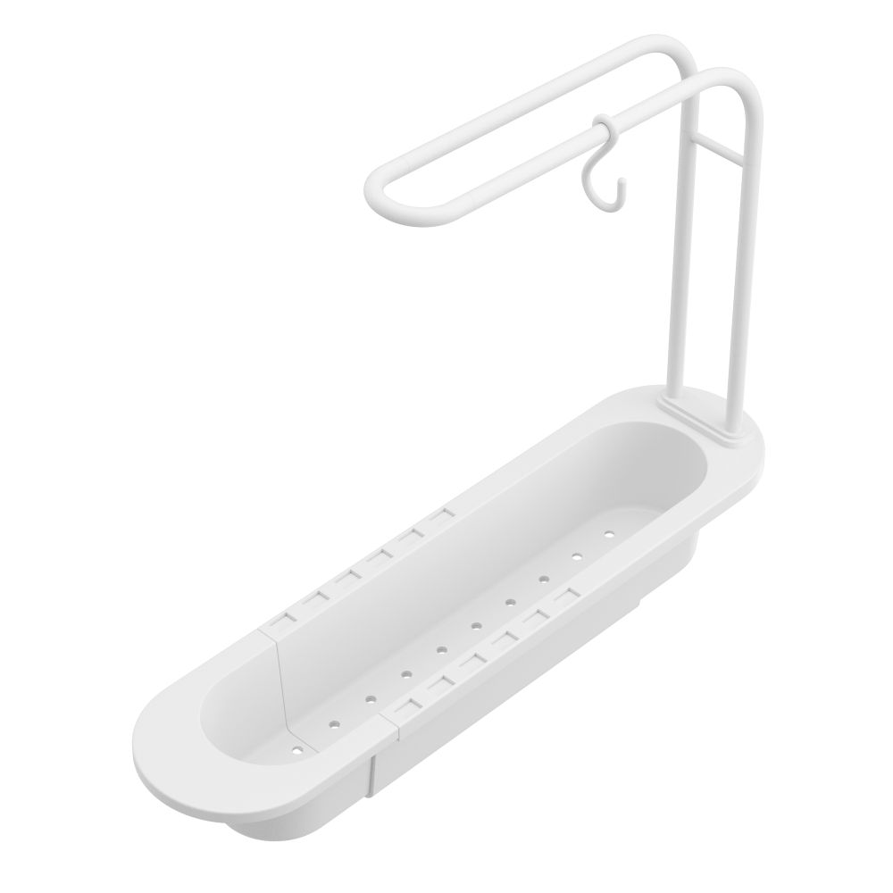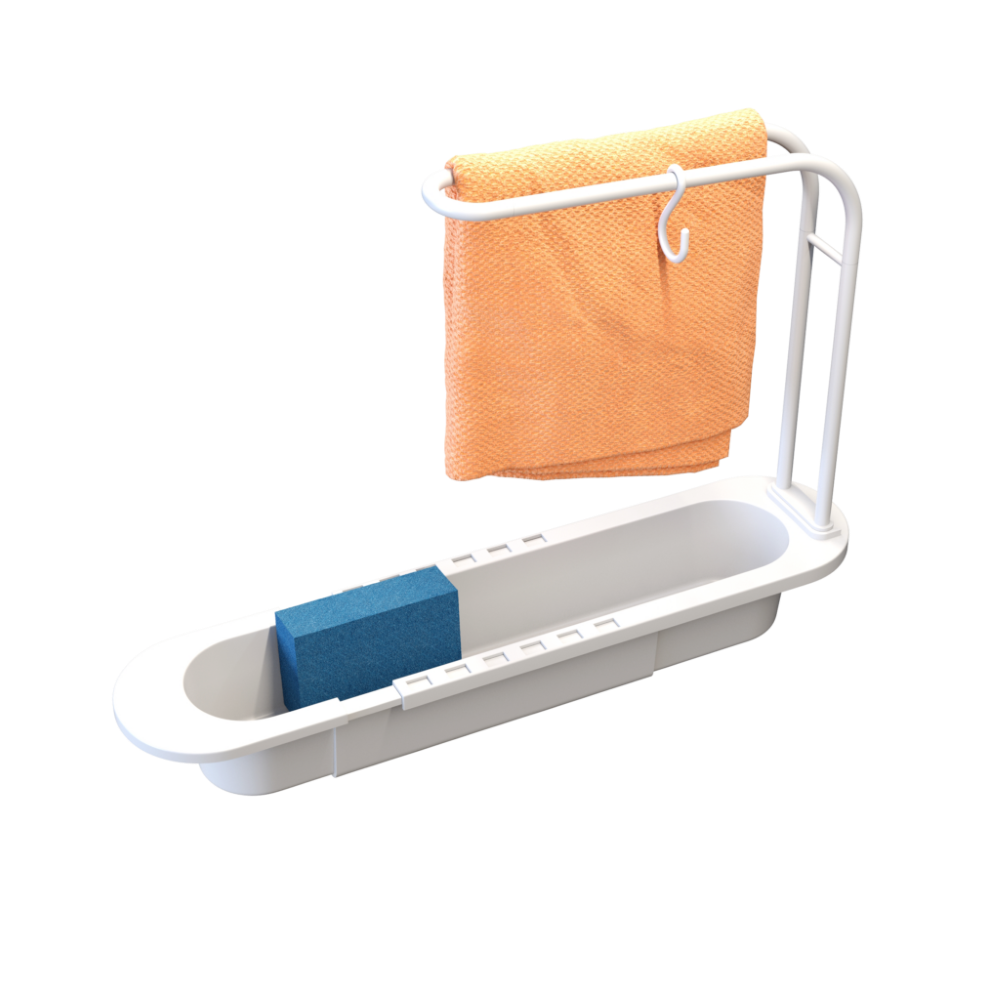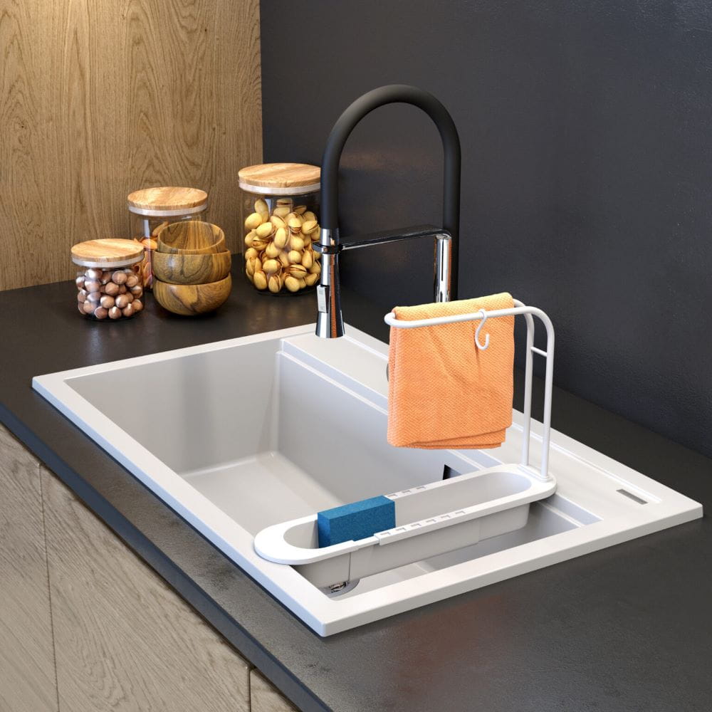 Organizer, oferując miejsce na przechowywanie akcesoriów kuchennych, znacząco ułatwia utrzymanie porządku w kuchni. Koszyk wyposażony jest w dziurkowane dno, które umożliwia cyrkulację powietrza i skuteczne odprowadzanie wody z powierzchni. Ponadto akcesorium posiada wygodny wieszak z haczykiem, na którym bez problemu wysuszymy ściereczki kuchenne. Dzięki regulacji organizer pasuje do większości zlewozmywaków dostępnych na rynku. Materiały użyte podczas produkcji gwarantują trwałość i solidność produktu.