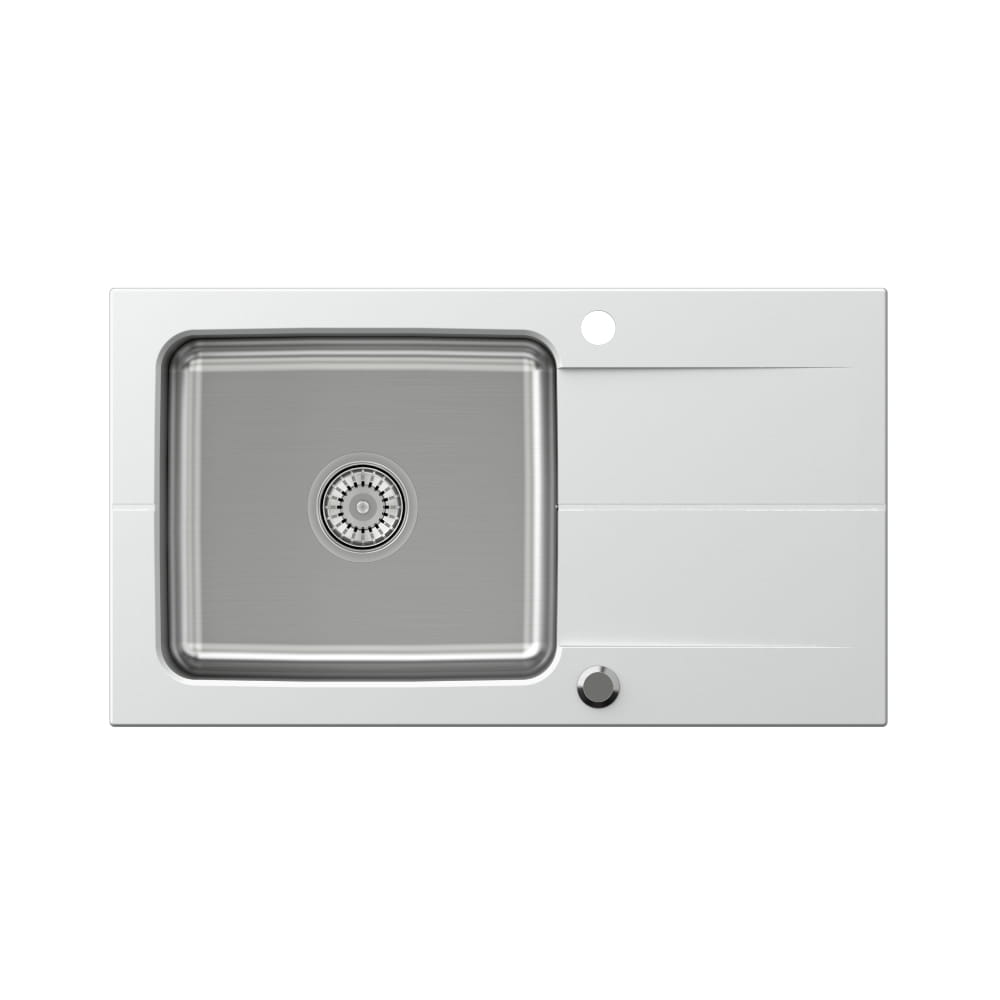 Produkt wyposażony jest w duży ociekacz, który dzięki zastosowaniu prostych linii wygląda jednocześnie minimalistycznie i bardzo nowocześnie. Brak na nim zbędnych dekoracji czy dodatkowych płaszczyzn. Elegancki wygląd to tylko część zalet. Zastosowane żłobienia sprawnie odprowadzą nadmiar wody bezpośrednio do komory. Spora powierzchnia ociekacza, stwarza dodatkowe miejsce odkładcze w kuchni. Wykorzystać je można na umieszczenie umytych naczyń, czy odsączonych warzyw, bez obawy o wydostanie się płynu poza obręb zlewu. Zastosowane materiały sprawią, że zarówno użytkowanie, jak i czyszczenie produktu będą komfortowe i nie nastręczy szczególnych trudności. Zlewozmywak posiada standardowo dwa wybite otwory. Jeden z nich, tradycyjnie przeznaczony jest na montaż baterii, drugi natomiast może zostać wykorzystany zgodnie z potrzebami użytkownika. Produkt, który otrzymujemy posiada w komplecie zaślepkę, estetycznie maskującą nawiercenie. Na zlewie w tym miejscu można umieścić dozownik płynu do mycia naczyń, lub zastosować inne rozwiązanie. Zlew uzupełnić można o dodatkowe akcesoria, niezwykle przydatne w kuchni. Aby zwiększyć jego powierzchnię użytkową, można zastosować zwijaną matę stalowo-silikonową, która doskonale sprawdzi się jako dodatkowe miejsce odkładnie na produkty spożywcze, naczynia czy gorący garnek.