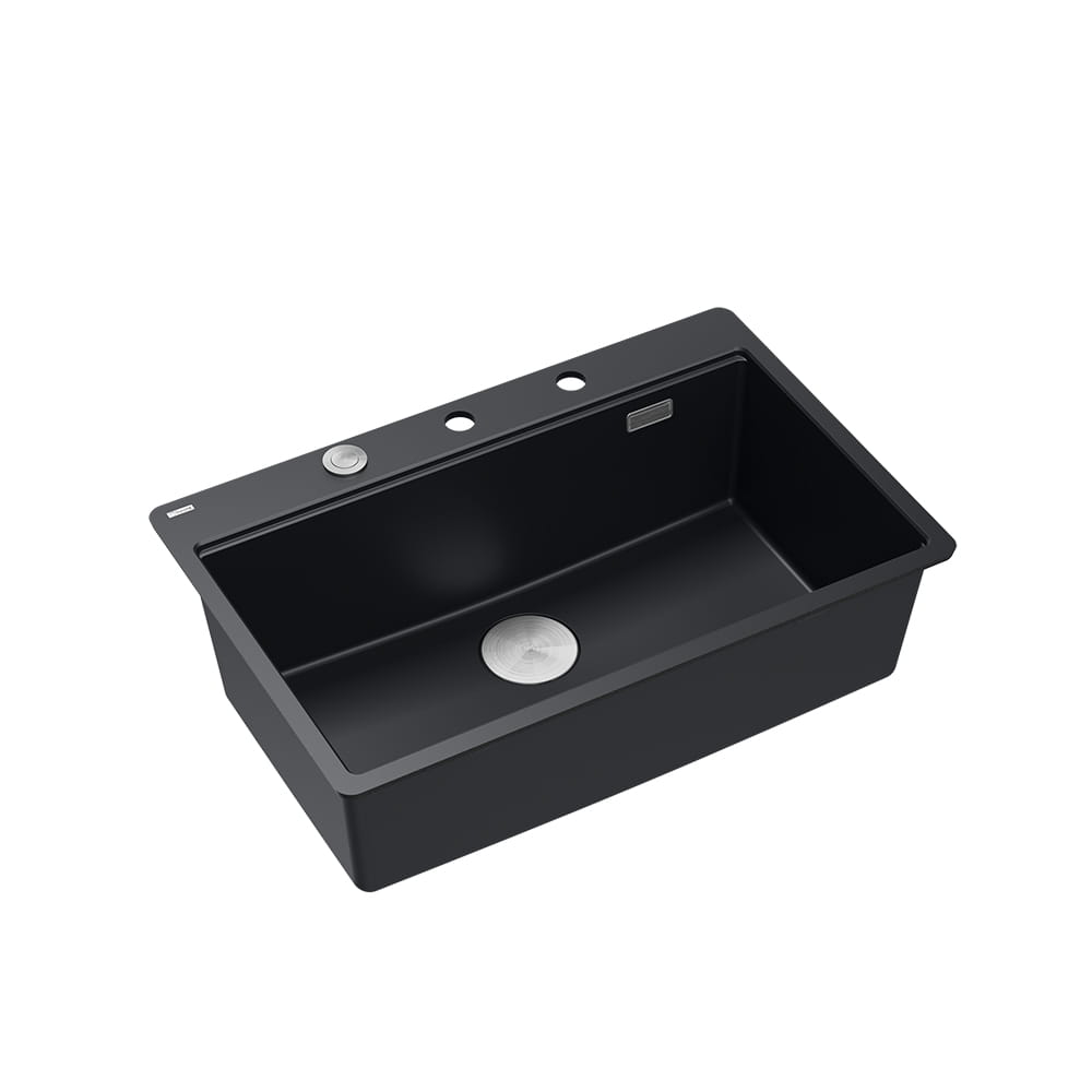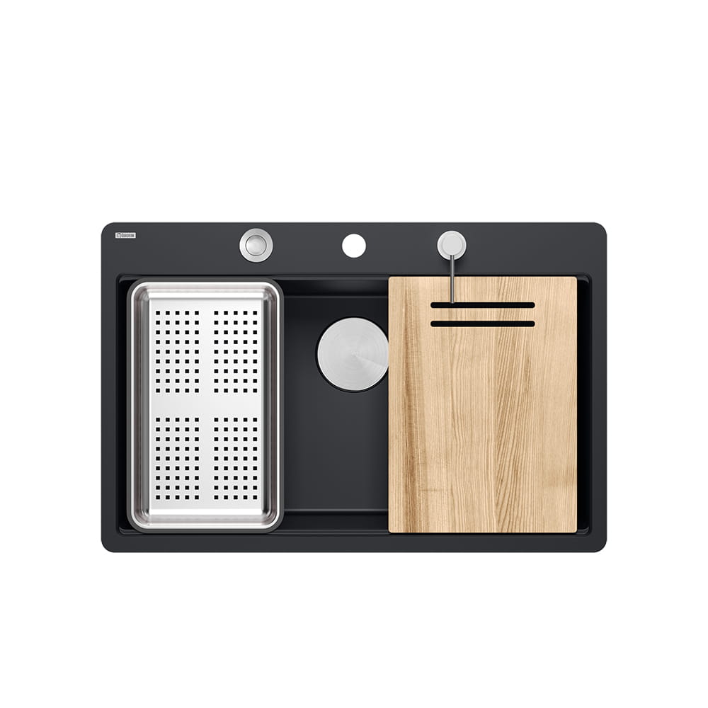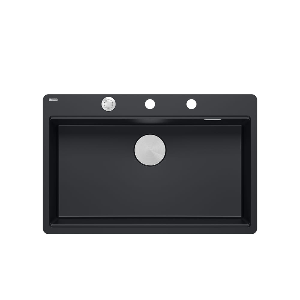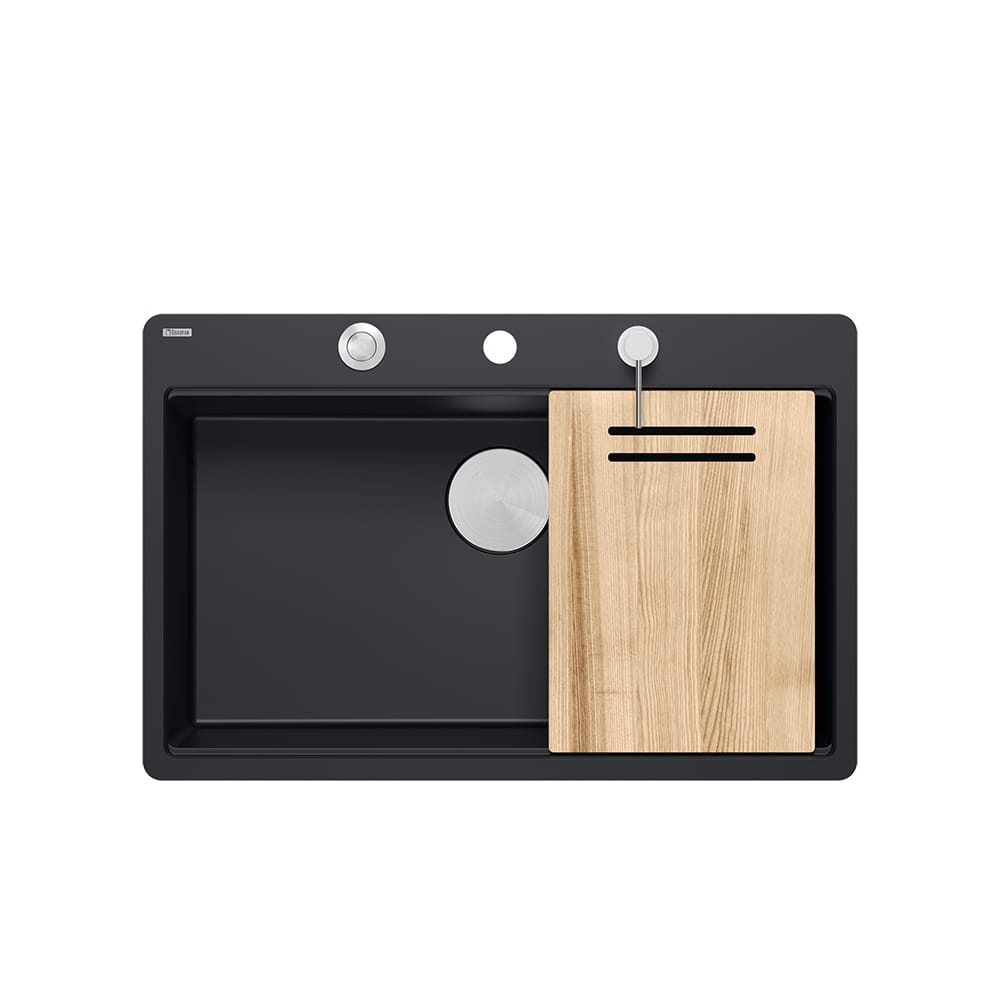 Quadron Marc 110 FM PRODUKT NA ZAMÓWIENIE | granitowy zlewozmywak kuchenny CZARNY mat + STAL | akcesoria: syfon, dozownik, deska, ociekarka | 1-komorowy na równi w blatem