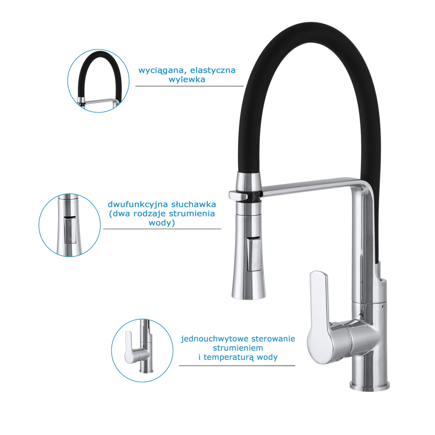 Bateria kuchenna Giro z wyciąganą wylewką czarna 3 strumienie wody