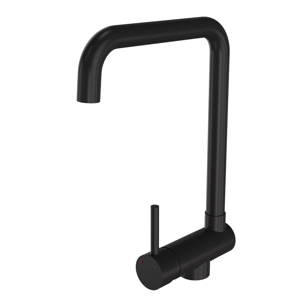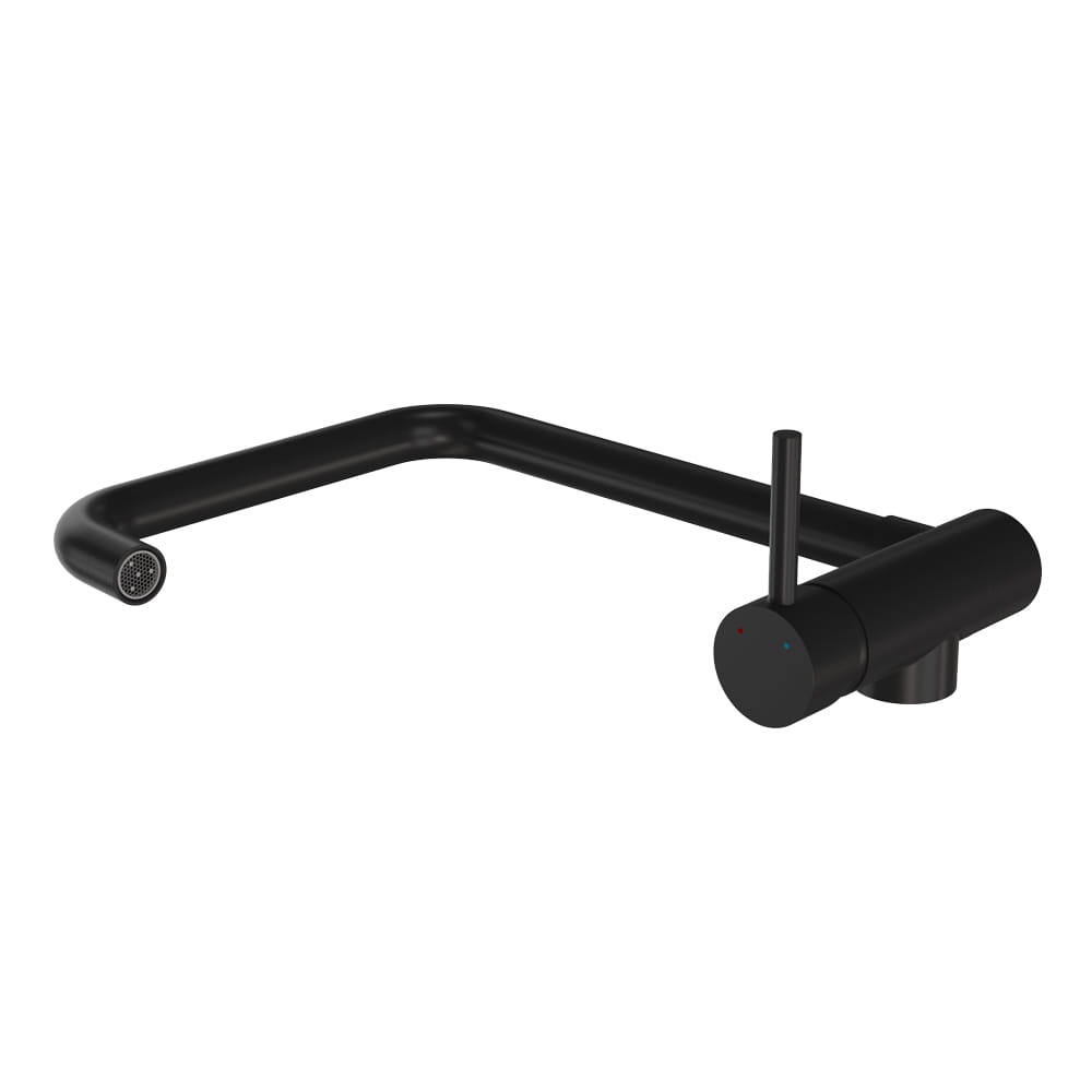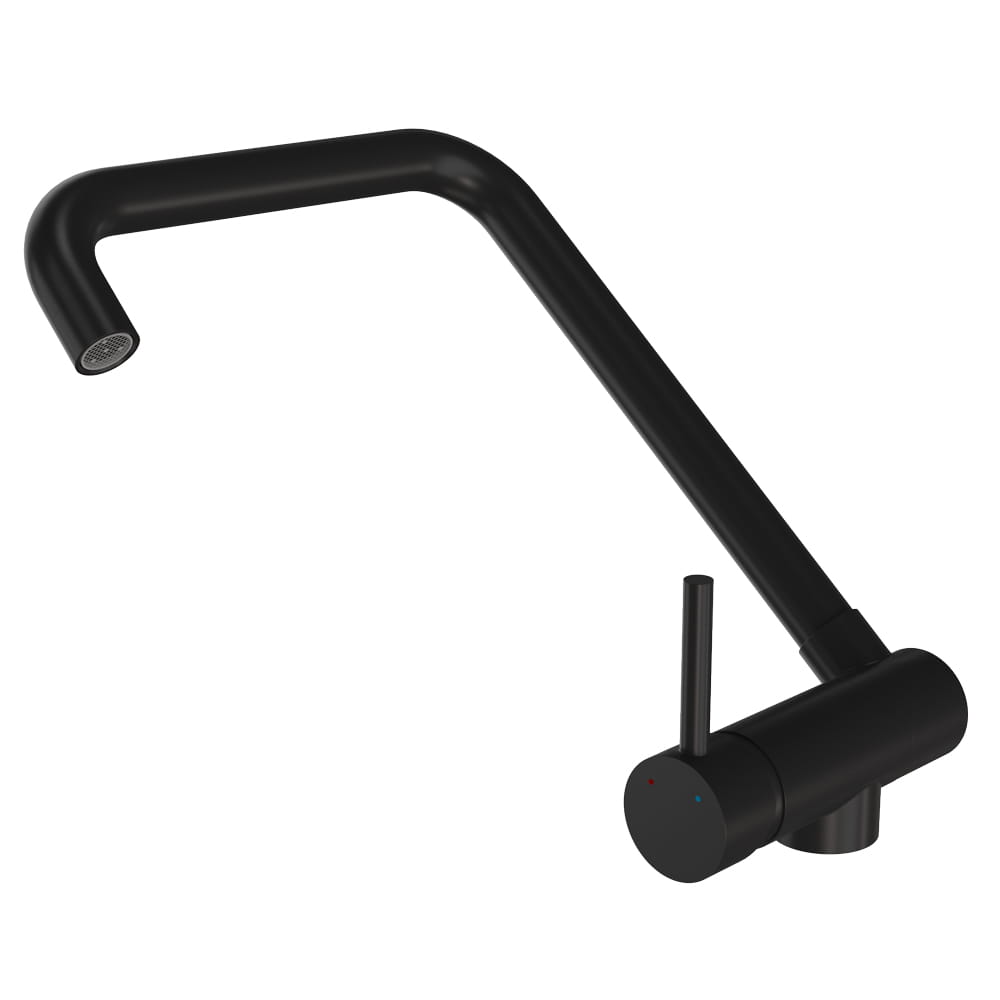 Podokienna bateria kuchenna o wysokiej jakości wykonana z mosiądzu, w kolorze czarnym. Ceramiczna głowica. Obrotowa 360', składana wylewka. Standardowy otwór montażowy 35 mm. Powłoka odporna na przebarwienia i wysoką temperaturę.