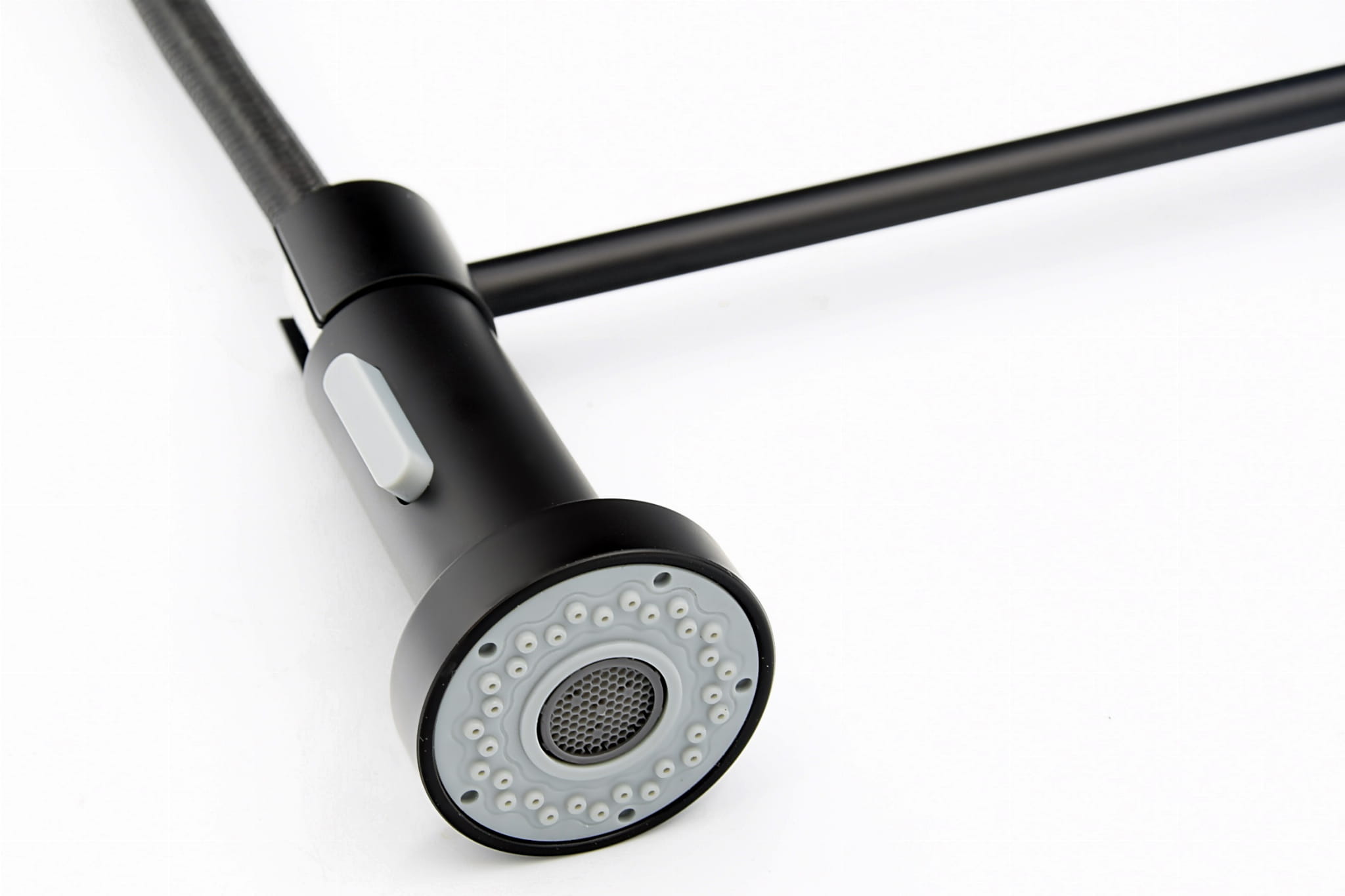 SPIRAL bateria kuchenna o wysokiej jakości, wykonana z mosiądzu, w kolorze czarny mat. Powłoka baterii odporna na przebarwienia i wysoką temperaturę, ceramiczna głowica 40 mm. Obrotowa, wyciągana wylewka 360'. Standardowy otwór montażowy 35 mm. Dwufunkcyjna słuchawka (dwa rodzaje strumienia wody).
