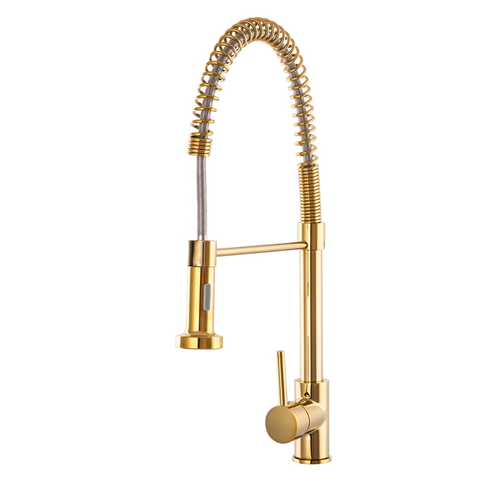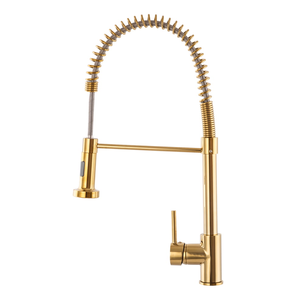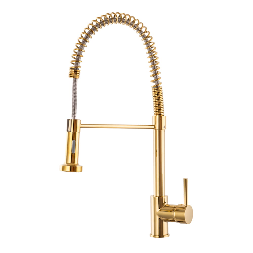 SPIRAL bateria kuchenna o wysokiej jakości, wykonana z mosiądzu, w kolorze złotym. Powłoka baterii odporna na przebarwienia i wysoką temperaturę, ceramiczna głowica 40 mm. Obrotowa, wyciągana wylewka 360'. Standardowy otwór montażowy 35 mm. Dwufunkcyjna słuchawka (dwa rodzaje strumienia wody).