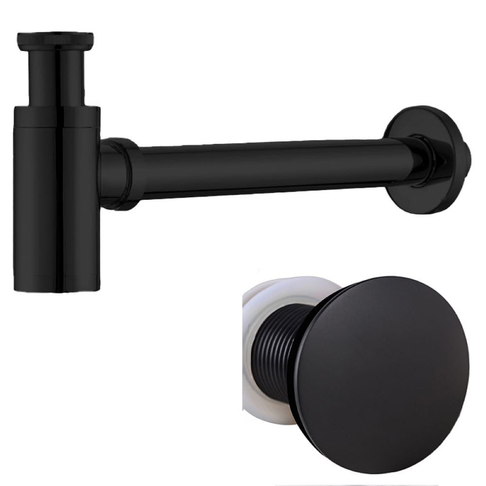 Syfon umywalkowy metalowy MIKE-BL + korek klik-klak czarny mat