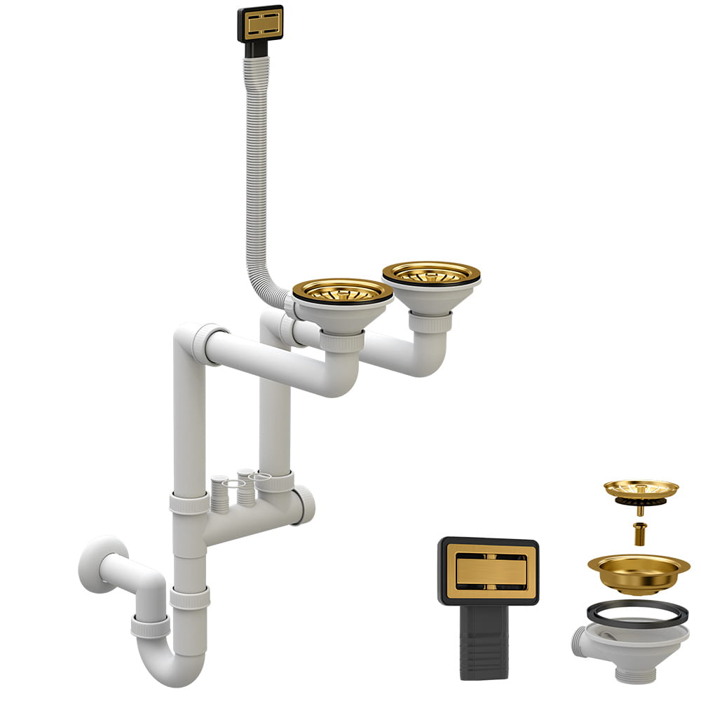 Syfon złoty oszczędzający miejsce manualny dwukomorowy – prostokątny przelew