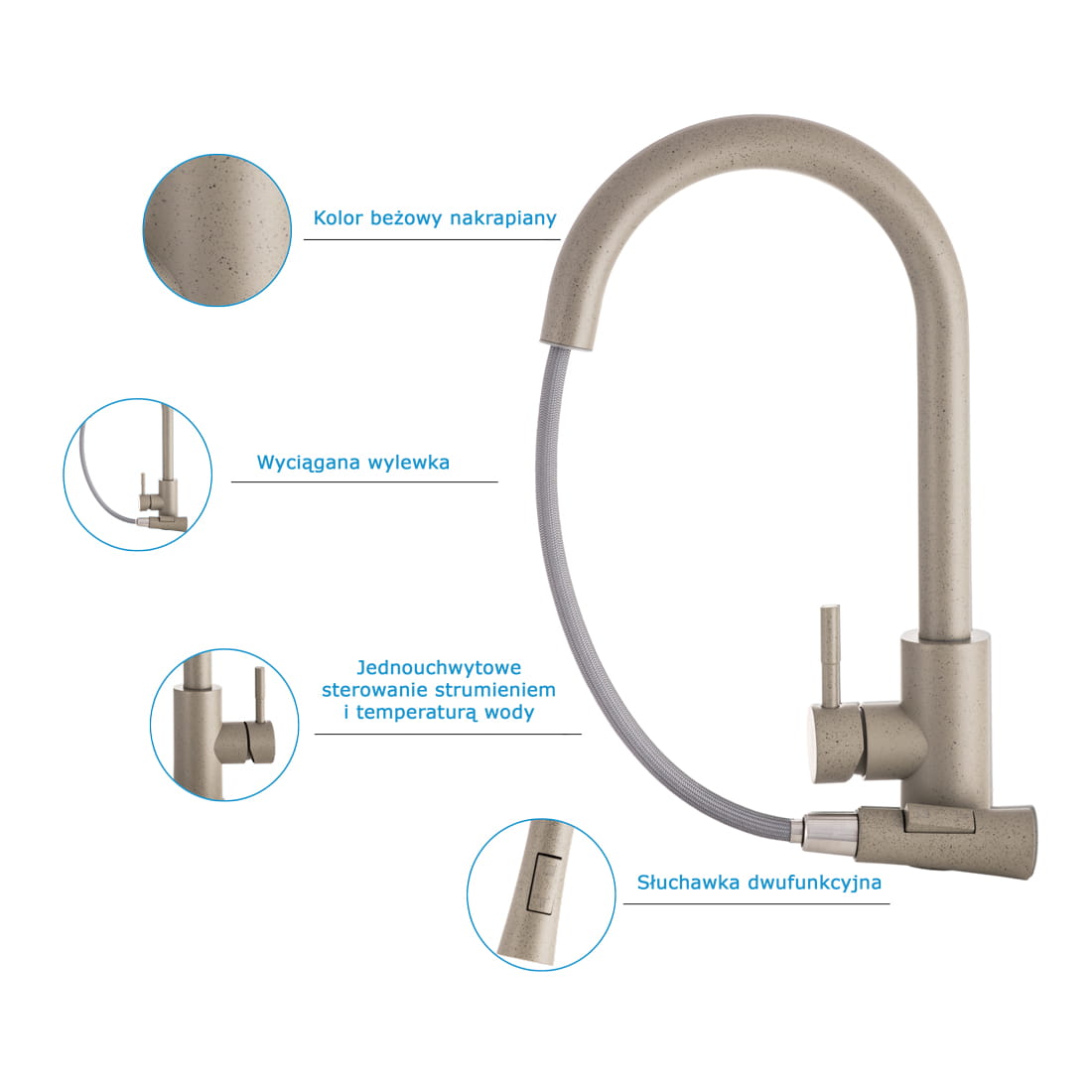 TARU SLIM bateria kuchenna z wyciąganą wylewką o wysokiej jakości, w kolorze beżowym. Powłoka baterii odporna na przebarwienia i wysoką temperaturę. Ceramiczna głowica 40 mm. Obrotowa 360', wyciągana wylewka. Dwufunkcyjna słuchawka (dwa rodzaje strumienia wody). Standardowy otwór montażowy 35 mm.