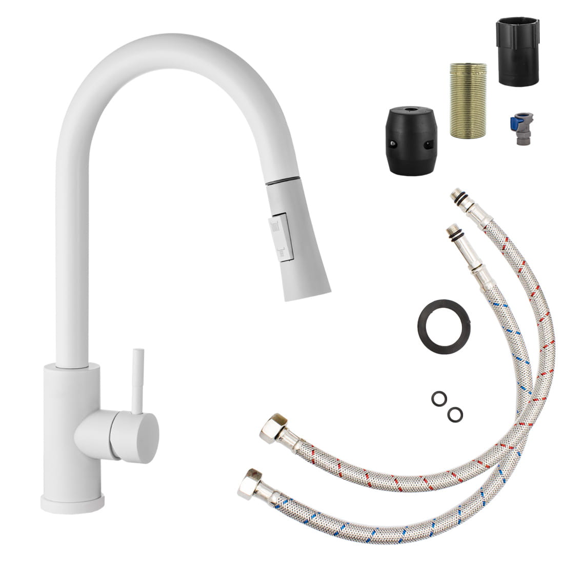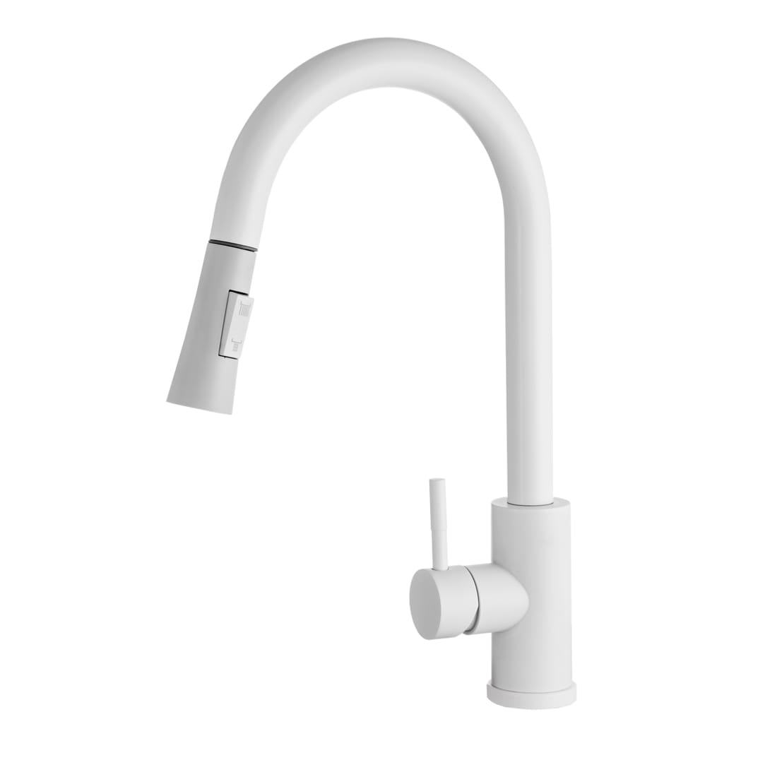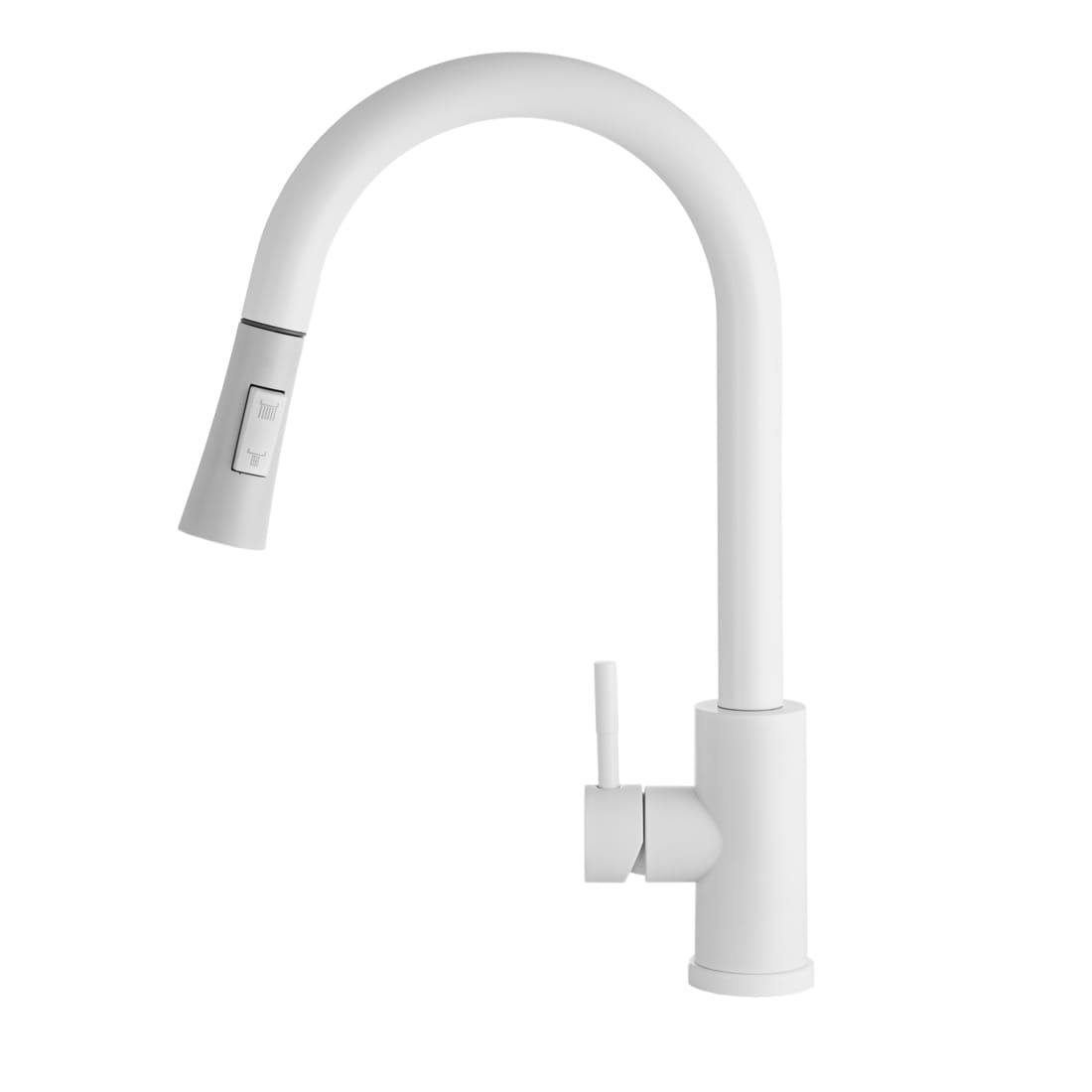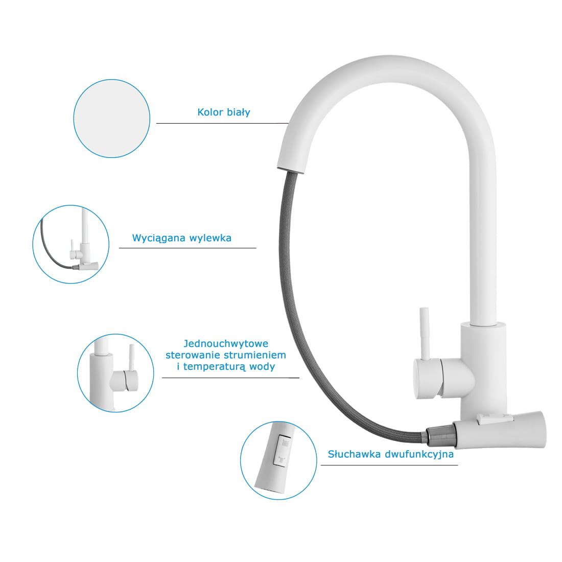 TARU SLIM bateria kuchenna z wyciąganą wylewką o wysokiej jakości, w kolorze białym. Powłoka baterii odporna na przebarwienia i wysoką temperaturę. Ceramiczna głowica 40 mm. Obrotowa 360', wyciągana wylewka. Dwufunkcyjna słuchawka (dwa rodzaje strumienia wody). Standardowy otwór montażowy 35 mm.