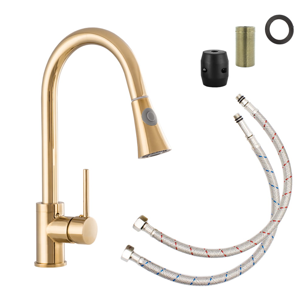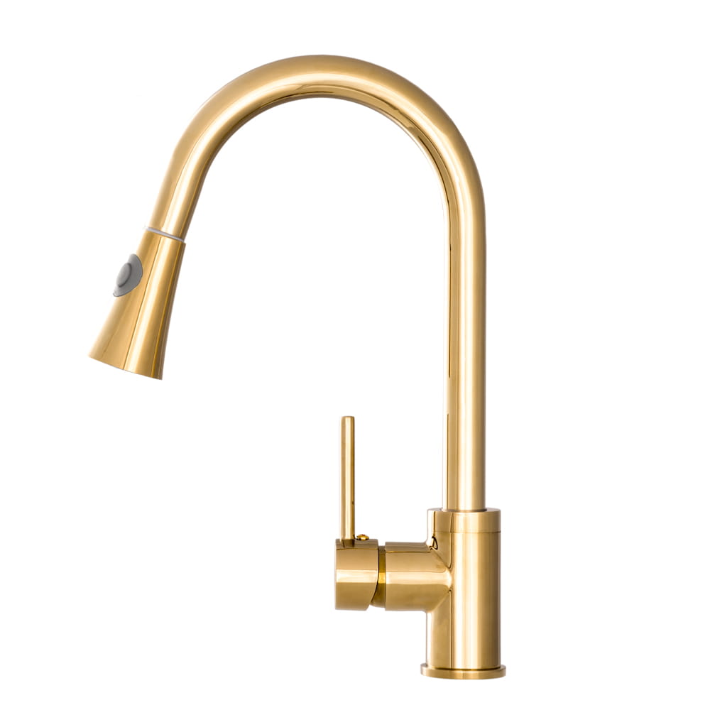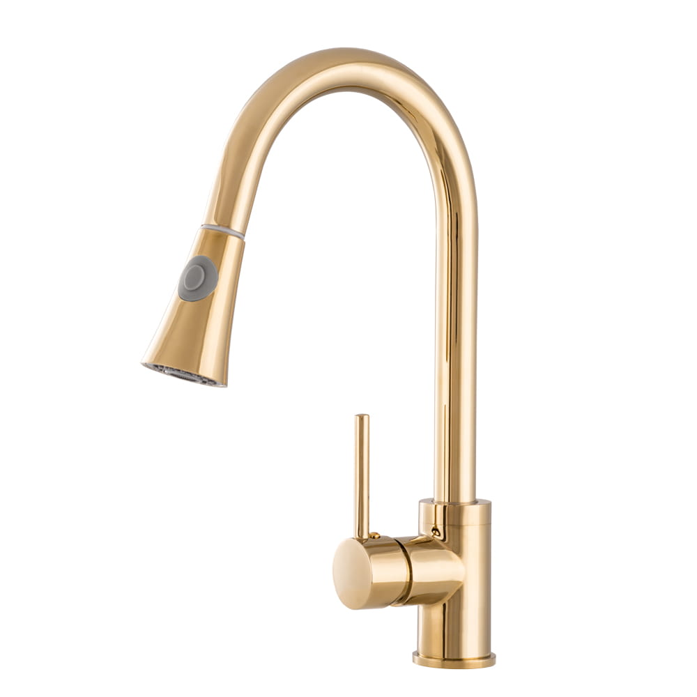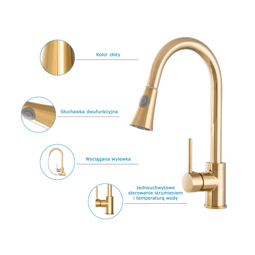 TARUS bateria kuchenna z wyciąganą wylewką o wysokiej jakości, wykonana z mosiądzu, w kolorze złotym. Powłoka baterii odporna na przebarwienia i wysoką temperaturę. Ceramiczna głowica 40 mm. Obrotowa 360', wyciągana wylewka. Dwufunkcyjna słuchawka (dwa rodzaje strumienia wody). Standardowy otwór montażowy 35 mm.