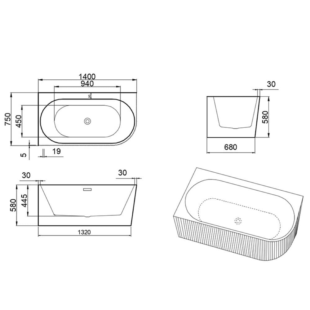 Wanna wolnostojąca przyścienna ryflowana Rio 504A lewa biała 140 x 75 cm przelew biały mat